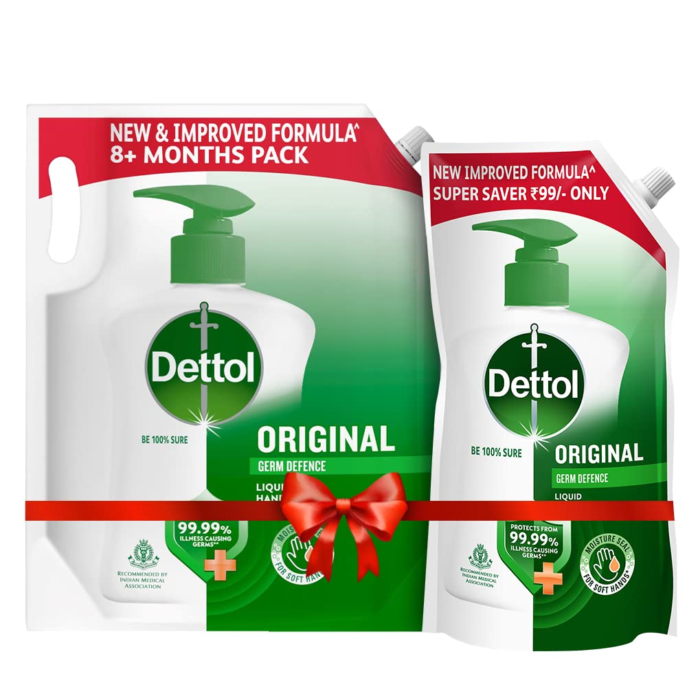 Dettol Liquid Hand wash Refill Original -1500 mlBe sure to protect your skin from 100 illness-causing germs and bacteria. Use Dettol's Original Germ Protection Handwash Liquid Soap pH balanced formula every day and keep your hands hygienically clean and refreshed. This hand wash provides soft and rich lather leaving behind clean hands and mild pine fragrance. The trusted germ-protection modus operandi acts like a barrier between your hands and a wide range of unseen germs. The soap-free formula with glycerin makes sure to keep your skin moisturised while the plant derived cleansers help ensure thorough cleaning. Dettol handwash also contains more than 85% naturally derived ingredients with no TCC & Triclosan giving another healthy reason for hand washing whenever in need. Wash hands properly with Dettol and help keep your family healthy! Safety Information: Keep out of reach of children unless under adult supervision. Avoid direct contact with eyes. For external use. In case of contact with eyes rinse immediately with plenty of water. If persistent irritation occurs seek medical attention.Dettol Liquid Handwash Refill - Original Germ Protection Hand Wash (Buy 1 Get 1 Free - 750ml each)| Antibacterial Formula | 10x Better Germ ProtectionBe sure to protect your skin from 100 illness-causing germs and bacteria. Use Dettol's Original Germ Protection Handwash Liquid Soap pH balanced formula every day and keep your hands hygienically clean and refreshed. This hand wash provides soft and rich lather leaving behind clean hands and mild pine fragrance. The trusted germ-protection modus operandi acts like a barrier between your hands and a wide range of unseen germs. The soap-free formula with glycerin makes sure to keep your skin moisturised while the plant derived cleansers help ensure thorough cleaning. Dettol handwash also contains more than 85% naturally derived ingredients with no TCC & Triclosan giving another healthy reason for hand washing whenever in need. Wash hands properly with Dettol and help keep your family healthy! Safety Information: Keep out of reach of children unless under adult supervision. Avoid direct contact with eyes. For external use. In case of contact with eyes rinse immediately with plenty of water. If persistent irritation occurs seek medical attention.