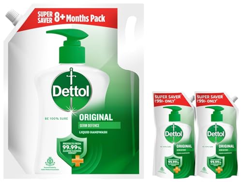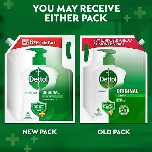 Dettol Liquid Handwash Refill - Original Hand Wash- 675ml (Pack of 2) | Germ Defence Formula | 10x Better Germ ProtectionBe 100% sure to protect your skin from 100 illness-causing germs and bacteria. Use Dettol's Original Germ Protection Handwash Liquid Soap pH balanced formula every day and keep your hands hygienically clean and refreshed. This hand wash provides soft and rich lather leaving behind clean hands and mild pine fragrance. The trusted germ-protection modus operandi acts like a barrier between your hands and a wide range of unseen germs. The soap-free formula with glycerin makes sure to keep your skin moisturised while the plant derived cleansers help ensure thorough cleaning. Dettol handwash also contains more than 85% naturally derived ingredients with no TCC & Triclosan giving another healthy reason for hand washing whenever in need. Wash hands properly with Dettol and help keep your family healthy! Safety Information: Keep out of reach of children unless under adult supervision. Avoid direct contact with eyes. For external use. In case of contact with eyes rinse immediately with plenty of water. If persistent irritation occurs seek medical attention.Dettol Liquid Handwash Refill - Original Hand Wash- 1500ml | Germ Defence Formula | 10x Better Germ ProtectionBe 100% sure to protect your skin from 100 illness-causing germs and bacteria. Use Dettol's Original Germ Protection Handwash Liquid Soap pH balanced formula every day and keep your hands hygienically clean and refreshed. This hand wash provides soft and rich lather leaving behind clean hands and mild pine fragrance. The trusted germ-protection modus operandi acts like a barrier between your hands and a wide range of unseen germs. The soap-free formula with glycerin makes sure to keep your skin moisturised while the plant derived cleansers help ensure thorough cleaning. Dettol handwash also contains more than 85% naturally derived ingredients with no TCC & Triclosan giving another healthy reason for hand washing whenever in need. Wash hands properly with Dettol and help keep your family healthy! Safety Information: Keep out of reach of children unless under adult supervision. Avoid direct contact with eyes. For external use. In case of contact with eyes rinse immediately with plenty of water. If persistent irritation occurs seek medical attention.