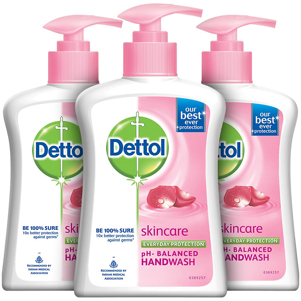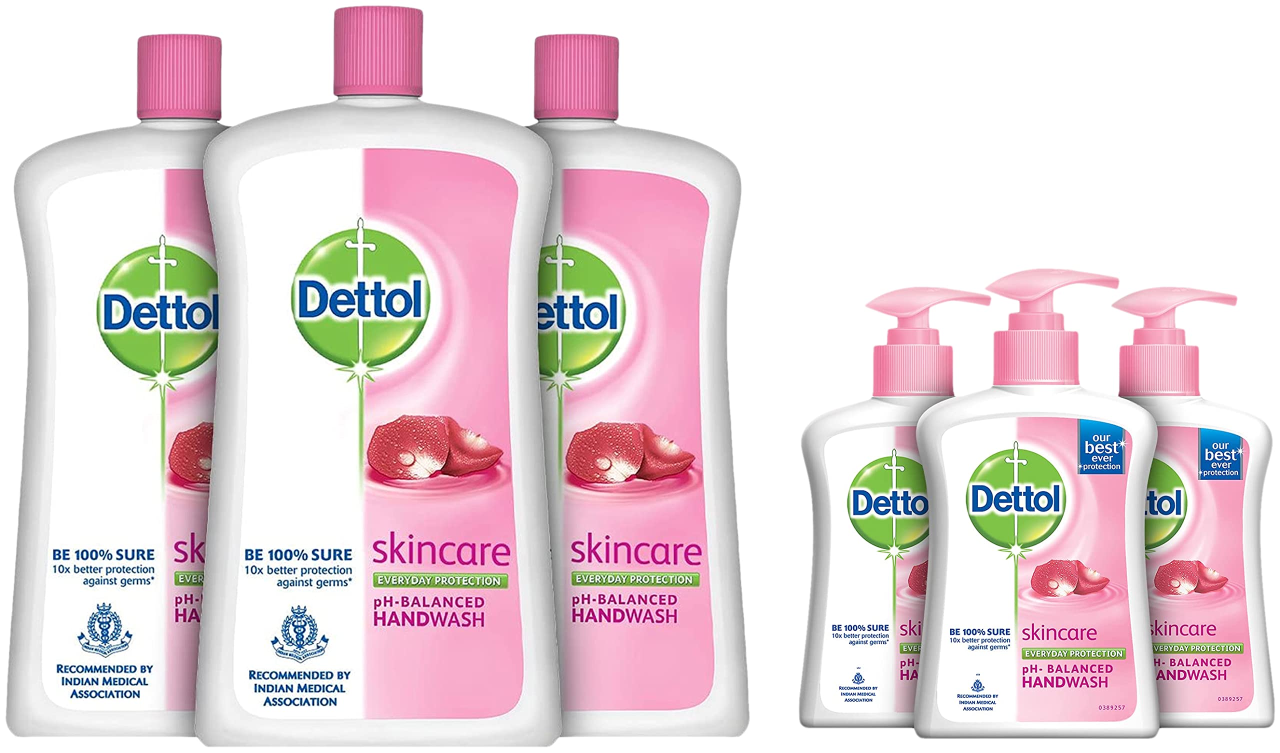 Dettol Liquid Handwash Refill Bottle - Skincare Moisturizing Hand Wash (Pack of 3 - 900ml each) | Antibacterial Formula | 10x Better Germ ProtectionBe 100% sure to protect your skin from 100 illness-causing germs and bacteria. Use Dettol's Skincare Germ Protection Handwash Liquid Soap pH balanced formula every day and keep your hands hygienically clean and refreshed. This hand wash provides soft and rich lather leaving behind clean hands and fragrance. The trusted germ-protection modus operandi acts like a barrier between your hands and a wide range of unseen germs. The soap-free formula with glycerin makes sure to keep your skin moisturised while the plant derived cleansers help ensure thorough cleaning. Dettol handwash also contains more than 85% naturally derived ingredients with no TCC & Triclosan giving another healthy reason for hand washing whenever in need. Wash hands properly with Dettol and help keep your family healthy! Safety Information: Keep out of reach of children unless under adult supervision. Avoid direct contact with eyes. For external use. In case of contact with eyes rinse immediately with plenty of water. If persistent irritation occurs seek medical attention.Dettol Liquid Handwash Dispenser Bottle Pump -Â Skincare Moisturizing Hand Wash (Pack of 3 - 200 ml each) | Antibacterial Formula | 10x Better Germ ProtectionBe 100% sure to protect your skin from 100 illness-causing germs and bacteria. Use Dettol's Skincare Germ Protection Handwash Liquid Soap pH balanced formula every day and keep your hands hygienically clean and refreshed. This hand wash provides soft and rich lather leaving behind clean hands and fragrance. The trusted germ-protection modus operandi acts like a barrier between your hands and a wide range of unseen germs. The soap-free formula with glycerin makes sure to keep your skin moisturised while the plant derived cleansers help ensure thorough cleaning. Dettol handwash also contains more than 85% naturally derived ingredients with no TCC & Triclosan giving another healthy reason for hand washing whenever in need. Wash hands properly with Dettol and help keep your family healthy! Safety Information: Keep out of reach of children unless under adult supervision. Avoid direct contact with eyes. For external use. In case of contact with eyes rinse immediately with plenty of water. If persistent irritation occurs seek medical attention.