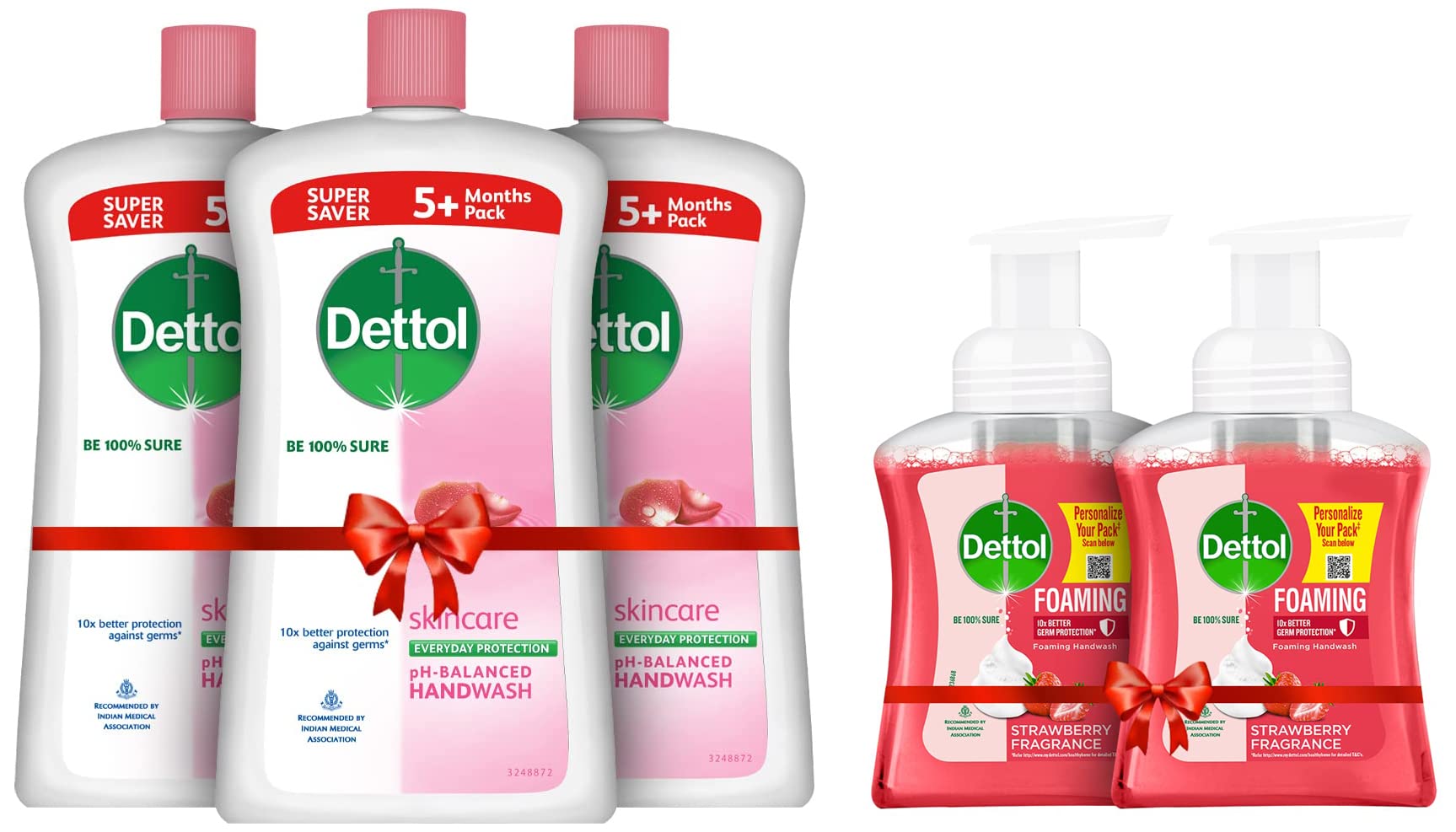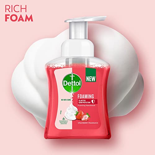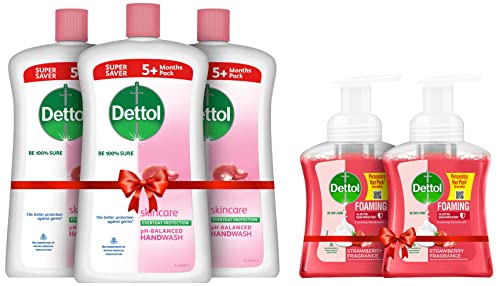 Dettol Liquid Handwash Refill Bottle - Skincare Moisturizing Hand Wash (Pack of 3 - 900ml each) | Antibacterial Formula | 10x Better Germ ProtectionBe 100% sure to protect your skin from 100 illness-causing germs and bacteria. Use Dettol's Skincare Germ Protection Handwash Liquid Soap pH balanced formula every day and keep your hands hygienically clean and refreshed. This hand wash provides soft and rich lather leaving behind clean hands and fragrance. The trusted germ-protection modus operandi acts like a barrier between your hands and a wide range of unseen germs. The soap-free formula with glycerin makes sure to keep your skin moisturised while the plant derived cleansers help ensure thorough cleaning. Dettol handwash also contains more than 85% naturally derived ingredients with no TCC & Triclosan giving another healthy reason for hand washing whenever in need. Wash hands properly with Dettol and help keep your family healthy! Safety Information: Keep out of reach of children unless under adult supervision. Avoid direct contact with eyes. For external use. In case of contact with eyes rinse immediately with plenty of water. If persistent irritation occurs seek medical attention.Dettol Foaming Handwash Pump - Strawberry (Pack of 2-250ml each) | Rich Foam | Moisturizing Hand Wash | Soft on HandsBe 100% sure to protect your skin from germs and bacteria. Dettol foaming handwash is a moisture-rich foam that removes dirt and germs while being gentle on skin. This hand wash provides soft and rich lather leaving behind clean hands and mild strawberry fragrance. Dettol handwash is dermatologically tested. Dettol handwash are free from parabens/ TCC and are ph balanced.
