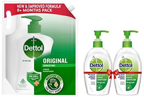 Dettol Liquid Handwash Refill - Original Germ Protection Hand Wash- 1500ml | Antibacterial Formula | 10x Better Germ ProtectionBe 100% sure to protect your skin from 100 illness-causing germs and bacteria. Use Dettol's Original Germ Protection Handwash Liquid Soap pH balanced formula every day and keep your hands hygienically clean and refreshed. This hand wash provides soft and rich lather leaving behind clean hands and mild pine fragrance. The trusted germ-protection modus operandi acts like a barrier between your hands and a wide range of unseen germs. The soap-free formula with glycerin makes sure to keep your skin moisturised while the plant derived cleansers help ensure thorough cleaning. Dettol handwash also contains more than 85% naturally derived ingredients with no TCC & Triclosan giving another healthy reason for hand washing whenever in need. Wash hands properly with Dettol and help keep your family healthy! Safety Information: Keep out of reach of children unless under adult supervision. Avoid direct contact with eyes. For external use. In case of contact with eyes rinse immediately with plenty of water. If persistent irritation occurs seek medical attention.Dettol Original Germ Protection Alcohol based Hand Sanitizer Pump 200ml (Pack of 2)DETTOL Hand Sanitizer is protection on the go; whether you are using a public toilet public transport or simply eating outside use DETTOL Sanitizer that offers water-less protection against germs. DETTOL hand sanitizer is specially formulated to protect you from 100 illness causing germs withot the use of soap and water. This rinse free and non-sticky sanitizer is recommended by Indian Medical Association. USAGE: Squirt a thumbnail amount onto the palms. Spread sanitizer and rub palms together. Rub tips of each hand with palm of other hand. Rub hands together until they are dry.