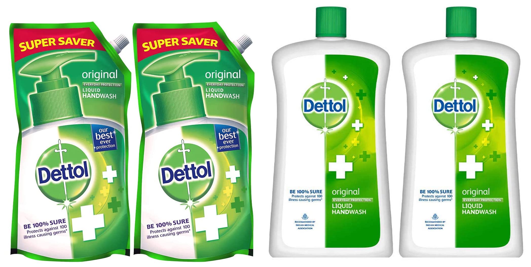 Dettol Liquid Handwash Refill - Original Germ Protection Hand Wash (Buy 1 Get 1 Free - 750ml each)| Antibacterial Formula | 10x Better Germ ProtectionBe sure to protect your skin from 100 illness-causing germs and bacteria. Use Dettol's Original Germ Protection Handwash Liquid Soap pH balanced formula every day and keep your hands hygienically clean and refreshed. This hand wash provides soft and rich lather leaving behind clean hands and mild pine fragrance. The trusted germ-protection modus operandi acts like a barrier between your hands and a wide range of unseen germs. The soap-free formula with glycerin makes sure to keep your skin moisturised while the plant derived cleansers help ensure thorough cleaning. Dettol handwash also contains more than 85% naturally derived ingredients with no TCC & Triclosan giving another healthy reason for hand washing whenever in need. Wash hands properly with Dettol and help keep your family healthy! Safety Information: Keep out of reach of children unless under adult supervision. Avoid direct contact with eyes. For external use. In case of contact with eyes rinse immediately with plenty of water. If persistent irritation occurs seek medical attention.Dettol Liquid Handwash Refill Bottle - Original Germ Protection Hand Wash 900 ml (Pack of 2) | Antibacterial Formula | 10x Better Germ ProtectionBe sure to protect your skin from 100 illness-causing germs and bacteria. Use Dettol's Original Germ Protection Handwash Liquid Soap pH balanced formula every day and keep your hands hygienically clean and refreshed. This hand wash provides soft and rich lather leaving behind clean hands and mild pine fragrance. The trusted germ-protection modus operandi acts like a barrier between your hands and a wide range of unseen germs. The soap-free formula with glycerin makes sure to keep your skin moisturised while the plant derived cleansers help ensure thorough cleaning. Dettol handwash also contains more than 85% naturally derived ingredients with no TCC & Triclosan giving another healthy reason for hand washing whenever in need. Wash hands properly with Dettol and help keep your family healthy! Safety Information: Keep out of reach of children unless under adult supervision. Avoid direct contact with eyes. For external use. In case of contact with eyes rinse immediately with plenty of water. If persistent irritation occurs seek medical attention.