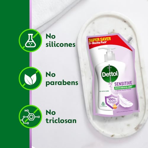 Be 100% sure to protect your skin from 100 illness-causing germs* and bacteria. Use Dettol's Sensitive Germ Protection Handwash Liquid Soap pH balanced formula every day and keep your hands hygienically clean and refreshed. This hand wash provides soft and rich lather leaving behind clean hands and fragrance. The trusted germ-protection modus operandi acts like a barrier between your hands and a wide range of unseen germs. The soap-free formula with glycerin makes sure to keep your skin moisturised while the plant derived cleansers help ensure thorough cleaning. Dettol handwash also contains more than 85% naturally derived ingredients with no TCC & Triclosan giving another healthy reason for hand washing whenever in need. Wash hands properly with Dettol and help keep your family healthy! Safety Information: Keep out of reach of children unless under adult supervision. Avoid direct contact with eyes. For external use. In case of contact with eyes rinse immediately with plenty of water. If persistent irritation occurs seek medical attention.