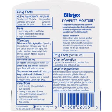 Upgrade your lip care with a surge of hydration! Blistex Complete Moisture features an innovative formula packed with key ingredients to quench thirsty lips leaving them feeling soft smooth and protected all day. NDC Code(s): 10157-9877-1