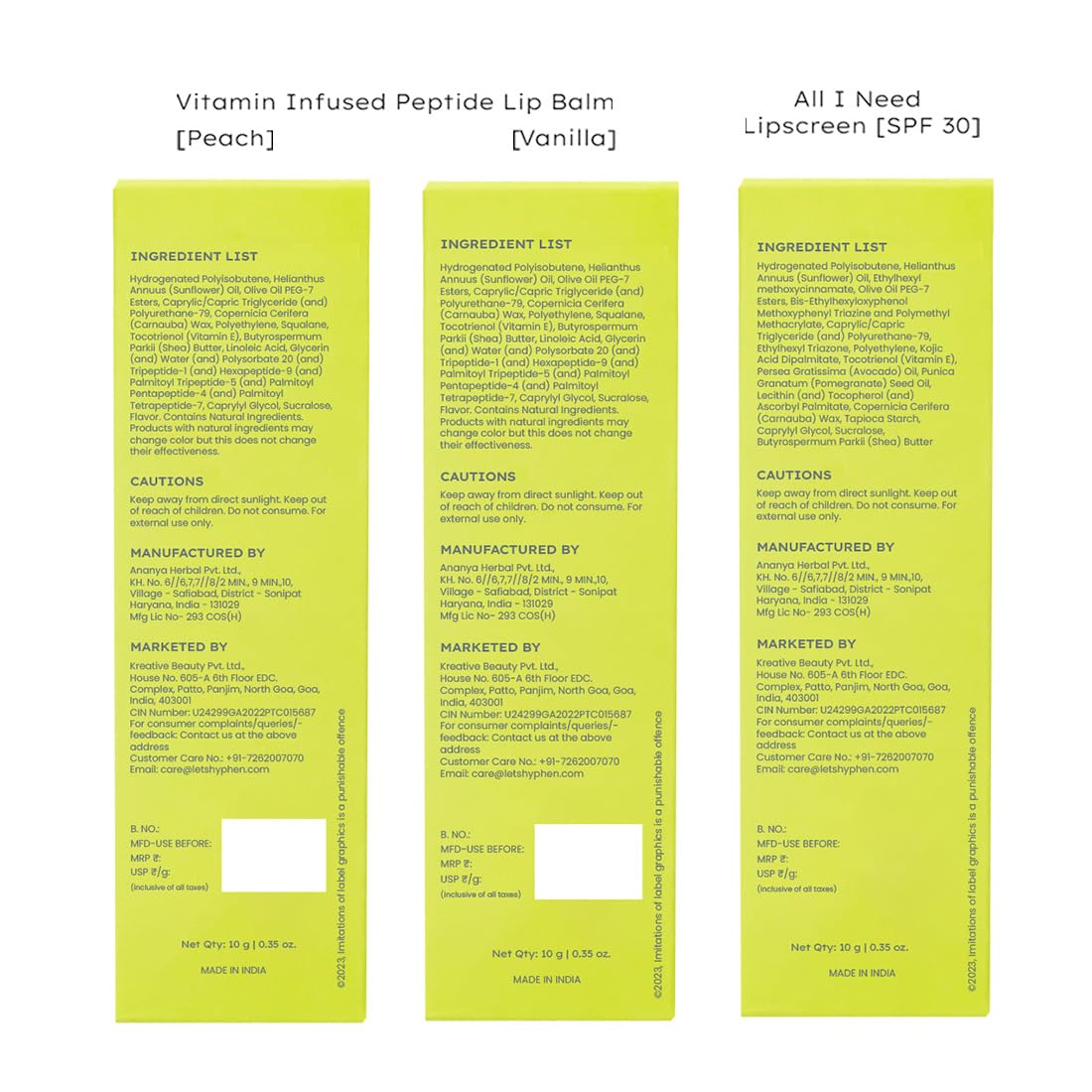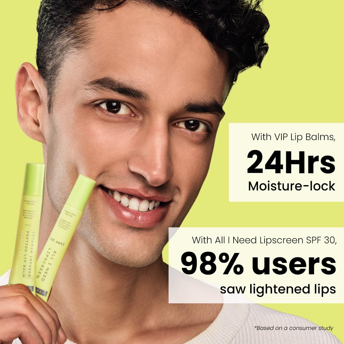 Juicy Lips Or Nothing Kit Say hello to juicy lips that are hydrated & protected from the sun with our Juicy Lips Or Nothing Kit. These lightweight non-greasy pack of 3 - Lip Balms will coat your lips with an irresistible glossy sheen and prevent them from overdrying. This kit consists of the flavourful Vitamin-Infused Peptide Lip Balm in Vanilla the Vitamin-Infused Peptide Lip Balm in Peach and the fragrance-free All I Need Lipscreen SPF 30. These are specially curated to give complete care for dry dehydrated and dark lips. The Juicy Lips Or Nothing Kit offers complete lip care and is boosted by ingredients like Peptides in their hydrating variants that hydrate and moisturize & improve skin barrier and elasticity for soft plump lips. 1% Vitamin E a powerful antioxidant helps hydrate moisturize and smoothen lips; Linoleic Acid rich in fatty acids moisturizes lips & forms a protective layer promoting hydration by preventing moisture loss. 2% Squalane deeply moisturizes lips without greasiness & prevents overdrying by locking in moisture keeping lips hydrated and plump while Shea Butter intensely moisturizes and hydrates too. These hydrating lip balms are found in 2 different flavour - one with delightful notes of Vanilla while the other with fruity undertones of Peach. Antioxidant-rich Vitamin C in the Lipscreen tackles pigmentation even tones lips and fights off skin damage; It also has 1% Vitamin E that is found in the other two lip balms that hydrates and moisturizes lips. Kojic Acid a mild AHA exfoliates and helps lighten dark spots; Avocado Oil rich in antioxidants moisturizes dry dehydrated lips making them supple and targets sun damage by reducing oxidative stress and inflammation; & antioxidant-rich Pomegranate Oil that exfoliates and helps lock in moisture. The Juicy Lips Or Nothing Kit is the ultimate lip care kit that heals and protects your lips for soft supple & kissable lips. This Lip Care Kit is 100% Vegan PETA Certified.