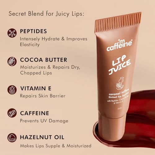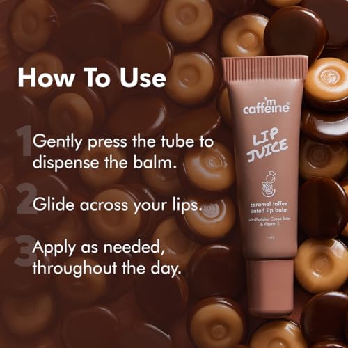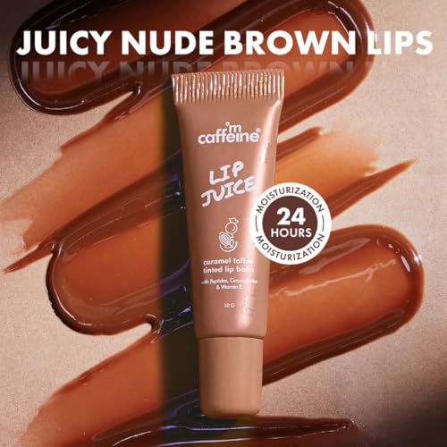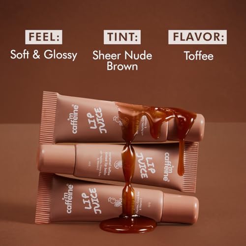 mCaffeine Lip Juice Tinted Lip Balm - Caramel Toffee | 24 hrs Moisturization | With Peptides Cocoa Butter & Vitamin E | Heals Dry & Chapped Lips | Lip Balm For Women | Sheer Brown Tint - 10g