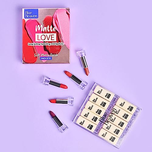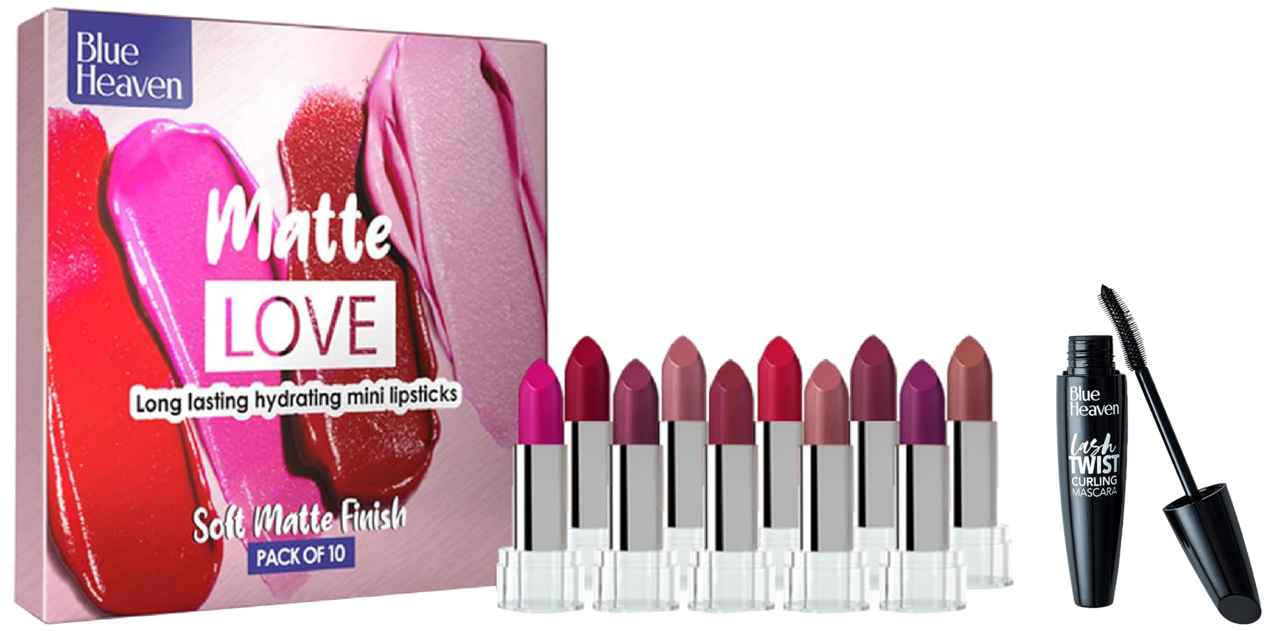 Blue Heaven Matte Love Mini Lipsticks Pack of 10 | Hydrating & Moisturizing Mini Roll on Lipsticks 13gm"Blue Heaven's Matte Love combo is here with 10 stunning shades that give a grogeous matte finish! There's a shade for every mood!"Blue Heaven Lash Twist Mascara Black 12 mlOur volumising mascara creates massive volume without weighing down lashes leaving your eyes with bigger bolder lashes. Our special silicon curling wand gives each lash a twist and lift. Never worry about runny mascara with our anti-clumping waterproof formula that lasts for 12 hours.