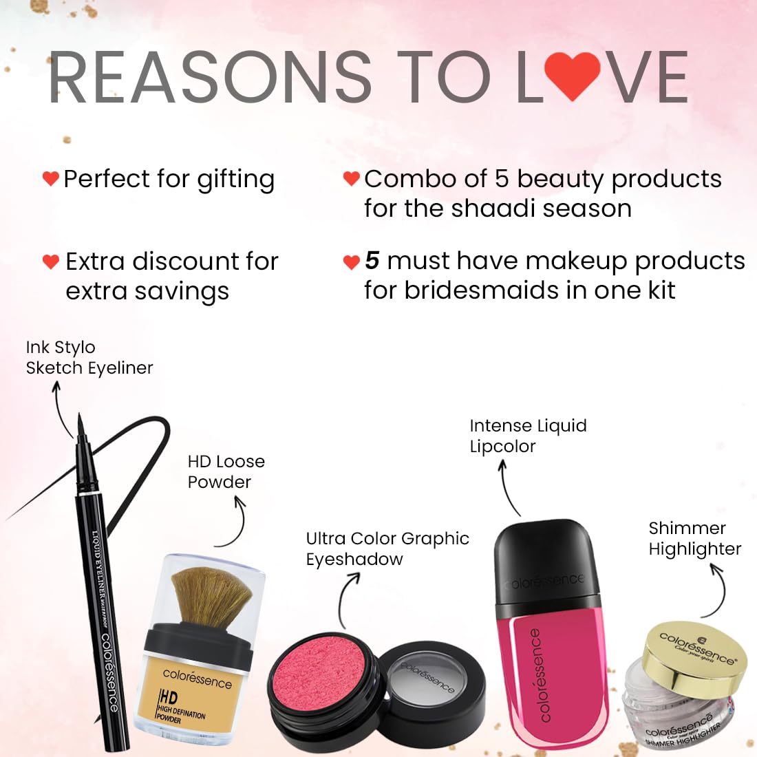 The Bridesmaid Budget kit is specially curated for brides' sisters and bffs. Packed with exclusive makeup products bridesmaids must get their hands on this budget-friendly yet exclusive makeup range! The kit comprises Ultra Color Graphic Eyeshadow (Rose Pink) Ink Stylo Sketch Eyeliner Intense Liquid Lipcolor - Rose Petal HD Loose Powder (Banana) and Shimmer Highlighter.