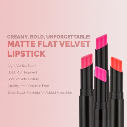 Introducing our hottest new lip colour matte flat velvet lipstick. These bold shades are rich in pigment and filled with moisture in a flat velvet finish. With added sheaf butter to hydrate lips and a soft smooth application your lips will feel as gorgeous as they look.