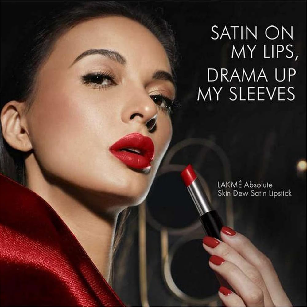 Introducing LAKME Absolute Skin Dew Satin Lipstick a luxurious lipstick that has the perfect combination of high coverage vibrant colour and moisturising benefits to create a high shine high glam look. This lipstick features a lush satin finish that delivers a velvety-smooth texture to the lips creating a sophisticated look that lasts for hours. The intense pigmentation of the lipstick offers high coverage and rich colour in just one stroke making it the perfect choice for those who want a bold and vibrant look. The hydrating and moisturizing benefits of the LAKME Absolute Skin Dew Satin Lipstick make it an excellent choice for those with drier lips. Infused with Avocado Oil and Hyaluronic Acid this lipstick hydrates and nourishes your lips leaving them feeling soft and supple. In addition to its moisturising benefits this lipstick also creates a dewy look that adds a youthful and fresh appearance to your makeup. The serum-infused satin soft texture of the lipstick glides smoothly over the lips creating a seamless flawless look that is perfect for any occasion. It is the go-to lipstick for any makeup lover! With its beautiful satin finish high coverage rich dewy color and hydrating properties the LAKME Absolute Skin Dew Satin Lipstick is the perfect showstopping essential that'll leave your lips feeling nourished and ensure you look stunning!
