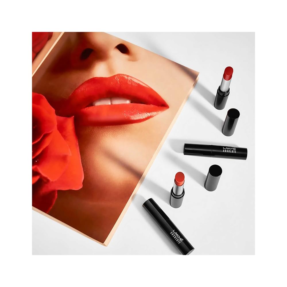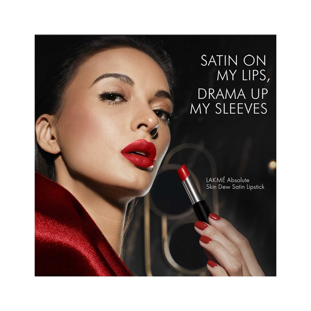 Introducing LAKME Absolute Skin Dew Satin Lipstick a luxurious lipstick that has the perfect combination of high coverage vibrant colour and moisturising benefits to create a high shine high glam look. This lipstick features a lush satin finish that delivers a velvety-smooth texture to the lips creating a sophisticated look that lasts for hours. The intense pigmentation of the lipstick offers high coverage and rich colour in just one stroke making it the perfect choice for those who want a bold and vibrant look. The hydrating and moisturizing benefits of the LAKME Absolute Skin Dew Satin Lipstick make it an excellent choice for those with drier lips. Infused with Avocado Oil and Hyaluronic Acid this lipstick hydrates and nourishes your lips leaving them feeling soft and supple. In addition to its moisturising benefits this lipstick also creates a dewy look that adds a youthful and fresh appearance to your makeup. The serum-infused satin soft texture of the lipstick glides smoothly over the lips creating a seamless flawless look that is perfect for any occasion. It is the go-to lipstick for any makeup lover! With its beautiful satin finish high coverage rich dewy color and hydrating properties the LAKME Absolute Skin Dew Satin Lipstick is the perfect showstopping essential that'll leave your lips feeling nourished and ensure you look stunning!