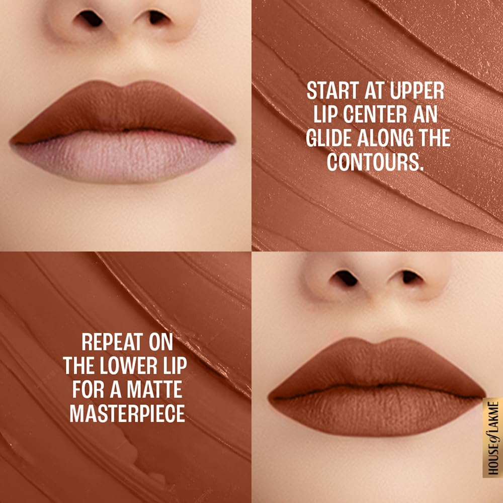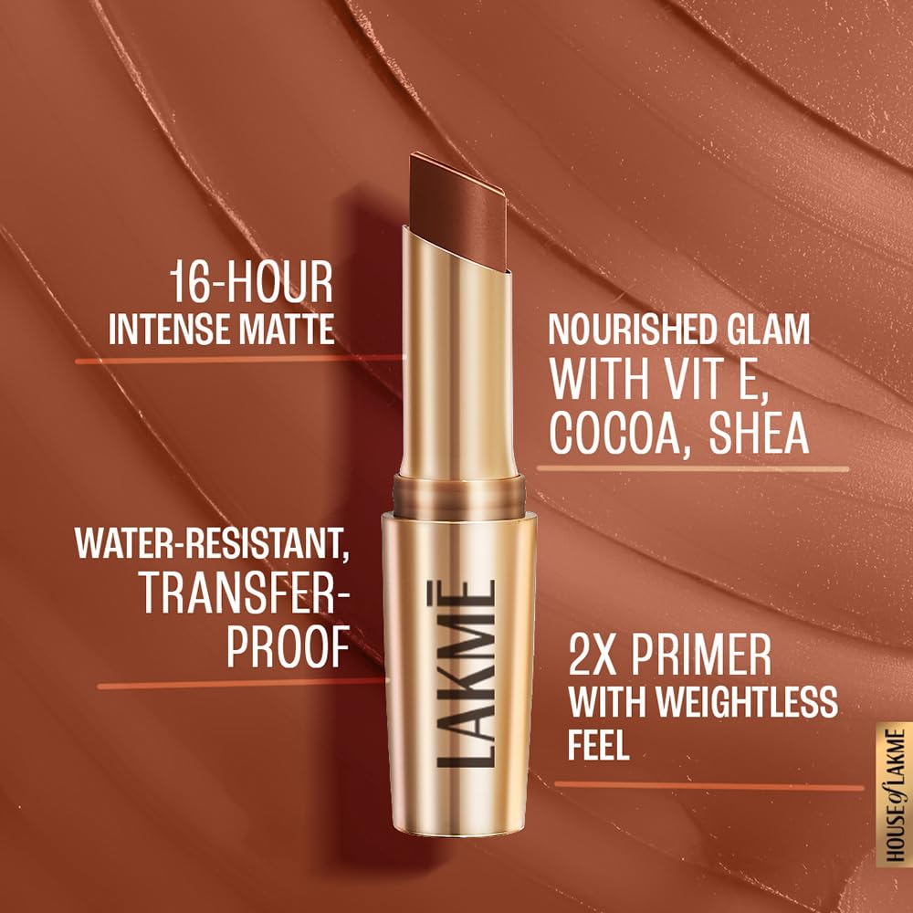 An unstoppable matte for an unstoppable you! Introducing Lakmé 9to5 Primer+Matte Lipstick with 2x built in primer that gives your lips a long lasting smooth matte finish. It glides onto your lips smoothly and feels extremely comfortable and lightweight. The built in primer ensures that the color settles onto your lips evenly. With 14 hour long stay power it is your perfect companion in conquering the day! Now say goodbye to touch ups through the day as this lipstick was made for the woman who doesn't stop! Available in 20 intensely rich matte shades your search for the perfect color ends with Lakmé 9to5 Primer+Matte Lipstick. Choose from a wide range of nudes pinks reds browns and plums that deliver rich color without drying out your lips. It glides on smoothly for a flawless matte finish and a vibrant color payoff. Pair it with Lakmé 9to5 Primer+Matte Perfect Cover Foundation Lakme 9TO5 Eye Color Quartet Eye Shadow and Lakmé Eyeconic Kajal to flaunt your fabulous looks round the clock! Look good and feel unstoppable as you put on your makeup. How to apply: Start applying the lipstick at the centre of your upper lip and follow the contours of the lips. Glide it across the bottom lip for a smooth finish.