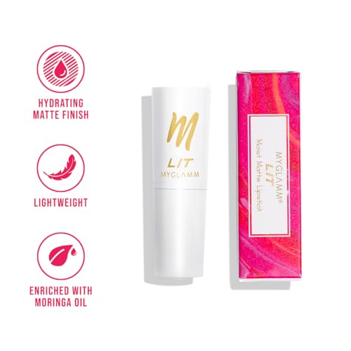 Where ya goin girl? Your cheap thrill is right here! A moist matte lipstick that gives intense colour in one swipe and is made for the budget beauty squad. MyGlamm LIT Moist Matte Lipstick is enriched with Moringa Oil and Vitamin E for an oh-so-smooth creamy and moist matte finish. Its light-as-air long-lasting formula glides on effortlessly to provide a soft focus effect; the result: a sassy bold pout that feels as comfortable as air. Available in 18 striking shades thatll make everybody go oh la la!