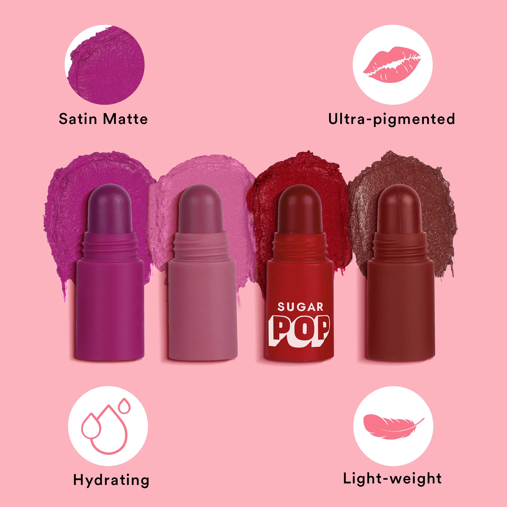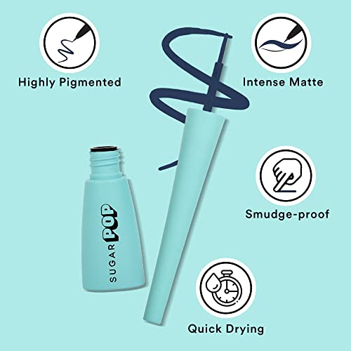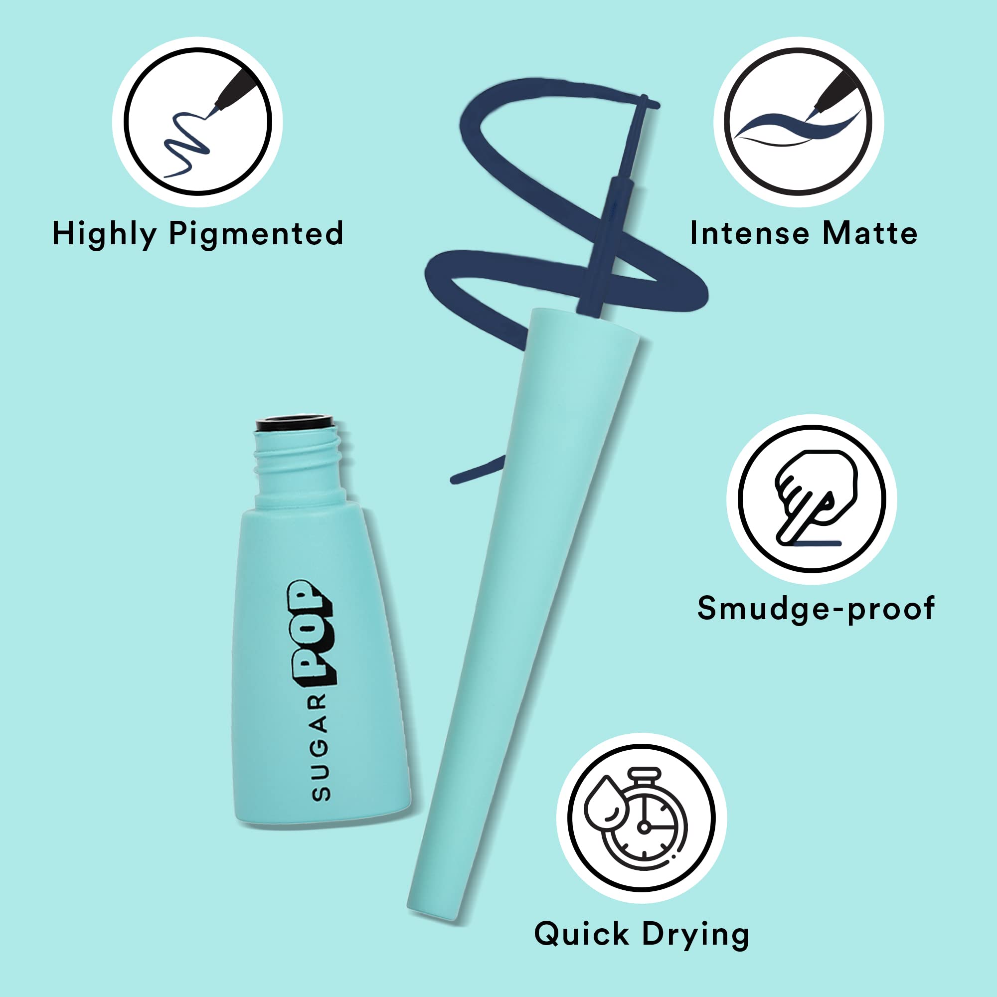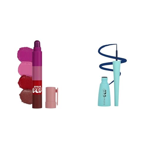 4 in 1 Lip Twist: Twist. Swipe. Slay Lipstick lovers pay close attention! With SUGAR POP 4 in 1 Lip Twist you can have it all! This unique packaging houses 4 stunning lippies to choose from and flaunt your pout anytime anywhere. From subtle nudes to bold hues this stackable lipstick has versatile shades to suit all skin tones. What's more? Infused with hyaluronic acid shea butter and jojoba oil goodness these lightweight lipsticks keep your lips soft and smooth. The satin matte texture glides on smoothly and offers full coverage in just one swipe. Be desk to dinner ready in a jiffy because this multi-purpose genius can be used as a blush or an eyeshadow. Just stack this in your bag for all your on-the-go beauty needs! Matte Eyeliner: A super pigmented matte liquid eyeliner that delivers intense smudge-proof and highly precise lines that last long. The easy-to-use felt-tip glides on smoothly and helps you create the sharpest of looks with ease.