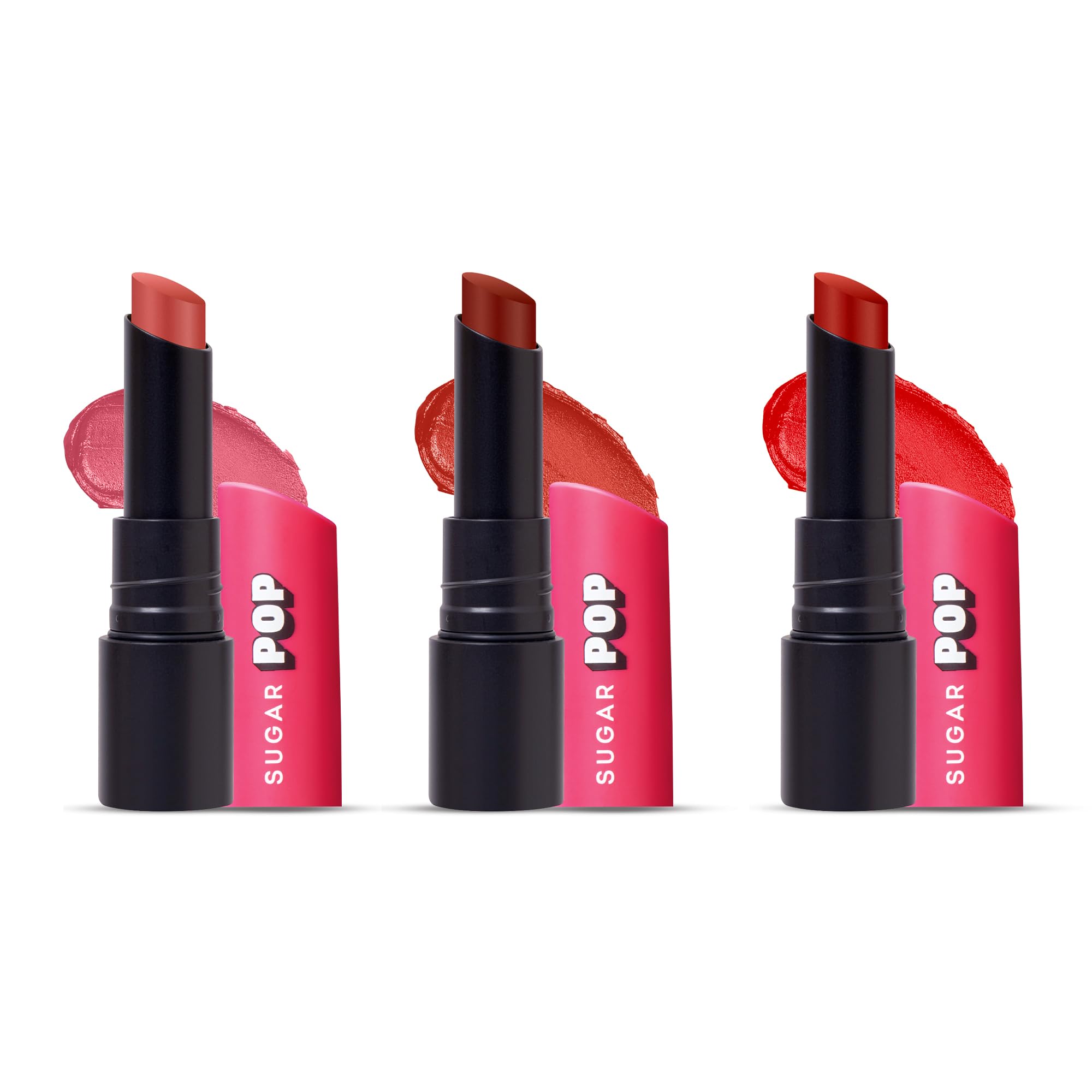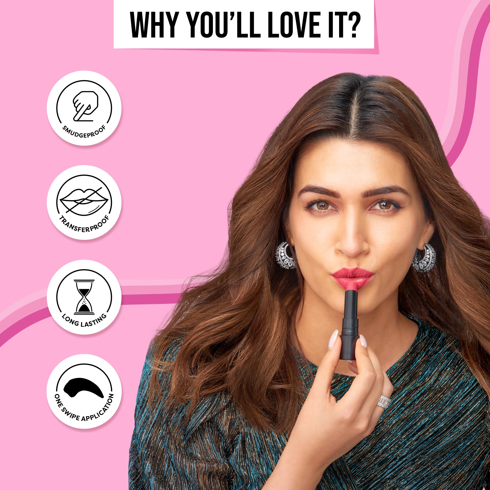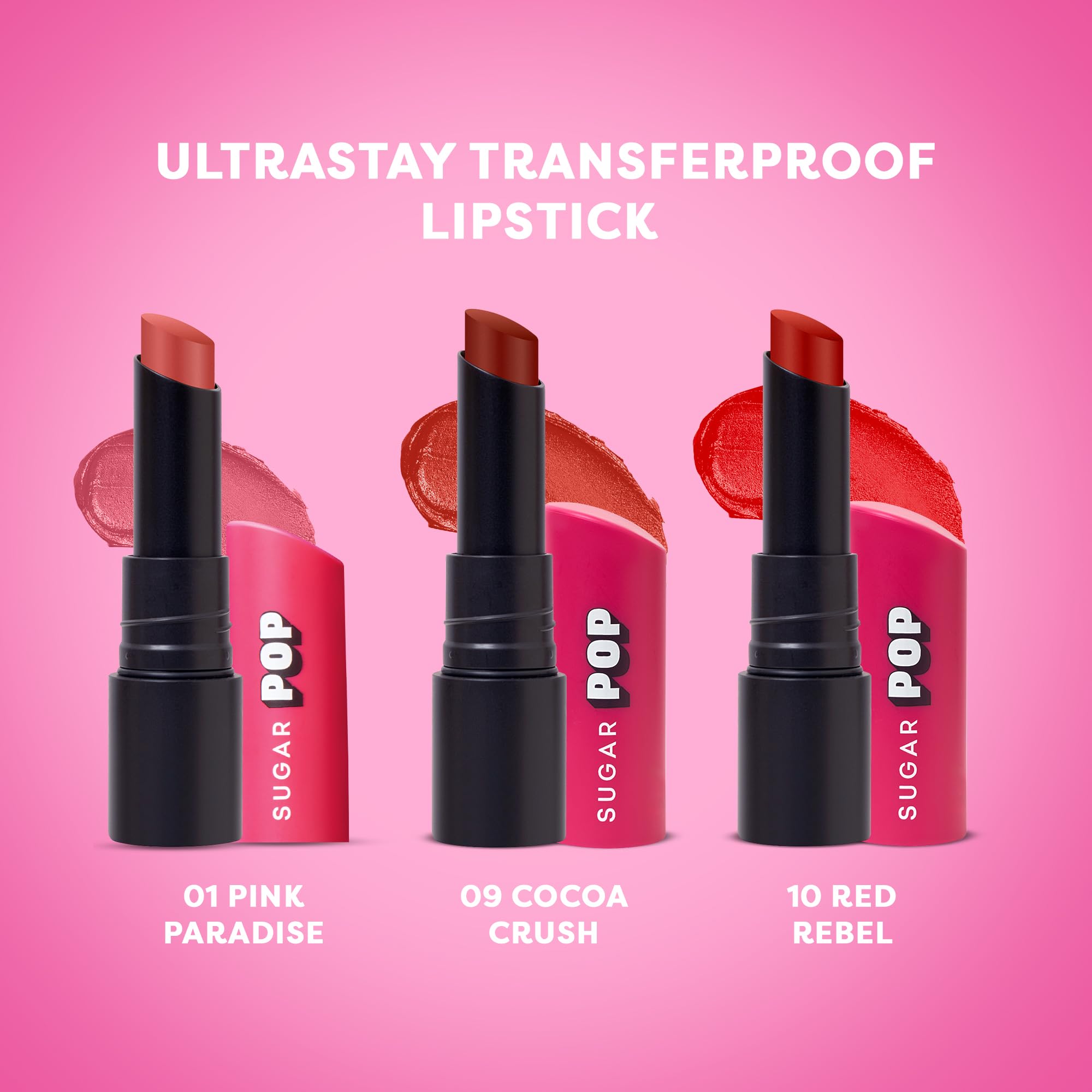 Psst! Have you heard of Kriti's latest obsession? It's none other than SUGAR POP Ultrastay Transferproof Lipstick our new intense matte bullet lipstick that offers everything you've always wished for in a lipstick! Super long lasting colour in one swipe? Check. Transferproof kissproof waterproof and smudgeproof? Absolutely. Need a shade that feels light and comfortable on your lips? We've got you covered. Available in striking shades this lipstick with its non drying full coverage formula promises picture perfect pout all day long. The perfectly shaped bullet effortlessly hugs the curve of your lips to make for an easy application. Infused with good for you ingredients like jojoba oil and vitamin E Ultrastay Transferproof Lipstick keeps your lips feeling soft and pampered while you eat sip kiss pout and navigate your day without worrying about touch ups! 'Colour Sahi Transfer Nahi' – that's the SUGAR POP Ultrastay promise!