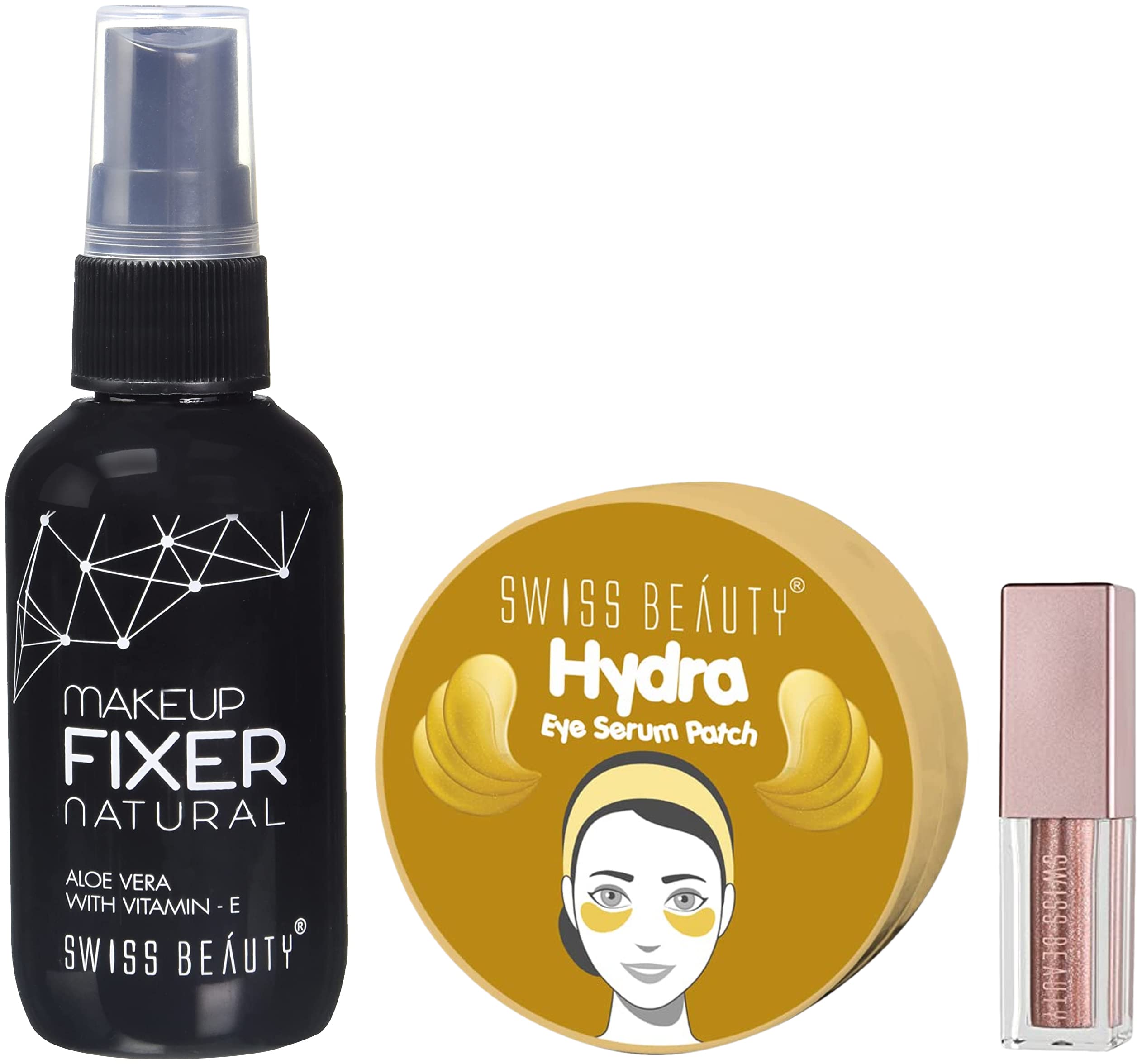 Swiss Beauty Hydra Eye Serum Patch Eye Makeup Gold 60pcsProduct Description : The Anti-wrikle Eye serum Mask brightens dark circles and replenished water and nutrients in the skin. The hydrogel eye patch contains sodium hyaluronate and many plant extracts that penetrate and moisten the skn. With gel-like formulation the mask boosts collagen and relaxes your face by removing crow feet and other ageing patterns.Swiss Beauty Long lasting Misty Finish Professional Makeup Fixer Spray for Face makeup | With Aloe Vera and Vitamin- E | Light weight quick dry makeup Setting spray |70 ML|Makeup fixer used either before or after makeup is to set your makeup so that it can stay longer and not be wiped off with touch of hands or run off with perspiration. Spray from a distance and let it dry before applying makeup or to set makeup or to set makeup spray after applying makeup.Swiss Beauty Metallic Liquid Eyeshadow | Highly Pigmented Eyeshadow with Radiant Shimmer Finish | Non-Transfer Insta Dry Long wearing Eyeshadow|Shade-05 3 ml |Swiss Beauty create stunning eye looks that perfectly enhance any style Swiss Beauty liquid eyeshadow is ideal for all your glammed up party looks. Daring and adventurous. This metallic eyeshadow effect can lavish your eyes with sparkle and shine brightening and emphasizing your makeup to the next level. Highly pigmented eyeshadow radiant shimmer finish long lasting non transfer.