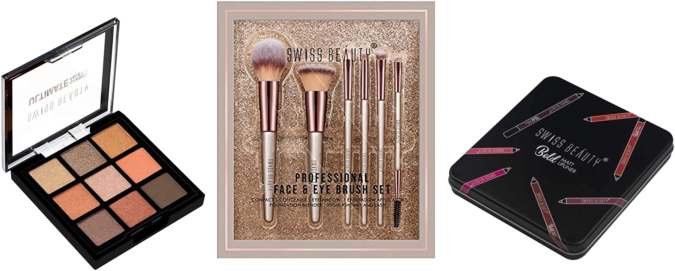 Swiss Beauty Premium Synthetic Bristle Professional Face and Eye Makeup Brushes Set with 6 makeup brushes | For Cream Liquid and Powder Formulation|Swiss Beauty combines high-tech materials with innovative design brush to make creating a pixel-perfect look easier than ever synthetic bristles are ultra-plush and smoother than the hair you'll find in other brushes. It creates flawless base enhanced look and the perfect finish like a pro. Each brush head is perfect shape allowing for precise application from dense coverage to a soft delicate finish. The collection is suitable for a wide range of products and every makeup need from powders creams and liquids to mineral makeup highlighter and shimmer. Brush names on the handles make for easy reference when creating your favourite look.Swiss Beauty Ultimate 9 Pigmented colors Eyeshadow Palette| Long wearing and Easily Blendable Eye makeup Palette | Matte Shimmers and Metallic | Multicolor - 03 6gm |Swiss Beauty absolutely new product It is a combination of matte semi-matte and shimmering eyeshadows. Light weight long wear smooth and easy to blend create a new sultry look every day ranging from a nature look to a more sultry evening look these colour tones are highly blendable with an amazing texture that is universally flattering and looks natural on all skin types The palette enables you to choose either a matte or shimmer look for your eyes. These mineral-based eye shadows are so smooth in texture that they are good for contouring eyes and creating multi-dimensional looks.Swiss Beauty Bold Matte Lipliner Pencil Multi Color (1.8g x12) Pack Of 12The product comes in safe package. The product will be an excellent pick for you.