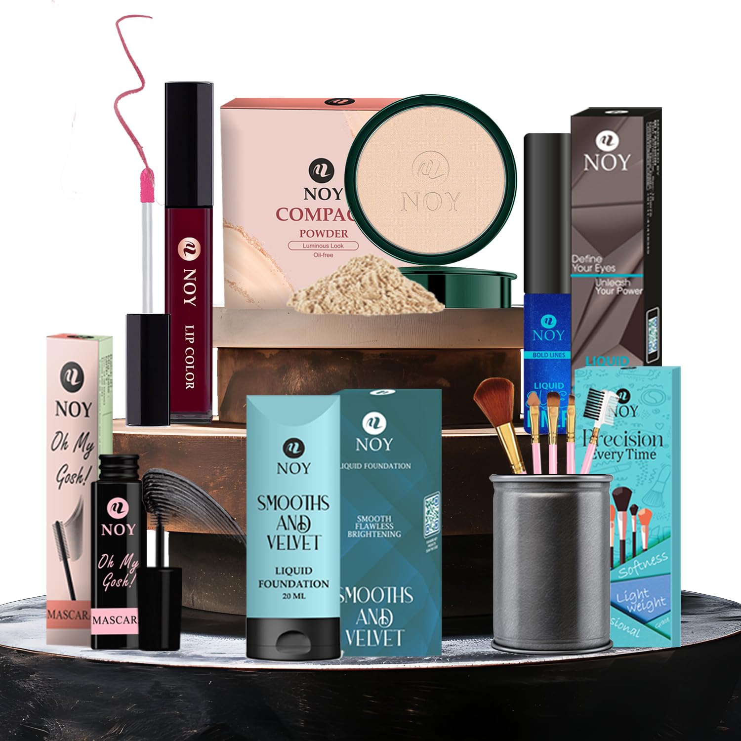 Elevate your beauty routine with the NOY Ultimate Makeup Kit a comprehensive collection designed for flawless everyday glamour. This all in one set features a selection of high quality products that cater to all your makeup needs. Start with the NOY Liquid Lipstick for a bold long lasting color that stays put throughout your day. The NOY Compact Powder provides a smooth matte finish ensuring a shine free complexion. Enhance your eyes with our NOY Liquid Eyeliner which delivers precise smudge proof lines and our NOY Liquid Mascara for voluminous lengthened lashes. Complete your look with the NOY Liquid Foundation offering full coverage and a natural finish. The kit also includes five professional grade makeup brushes ideal for applying and blending products with ease. Whether you're preparing for a day at the office or a night out the NOY Ultimate Makeup Kit has everything you need to achieve a stunning look effortlessly.