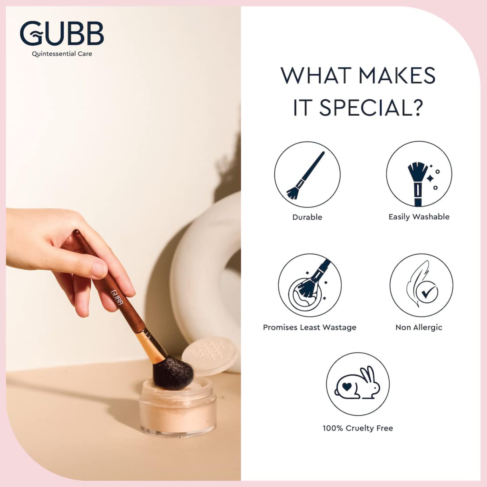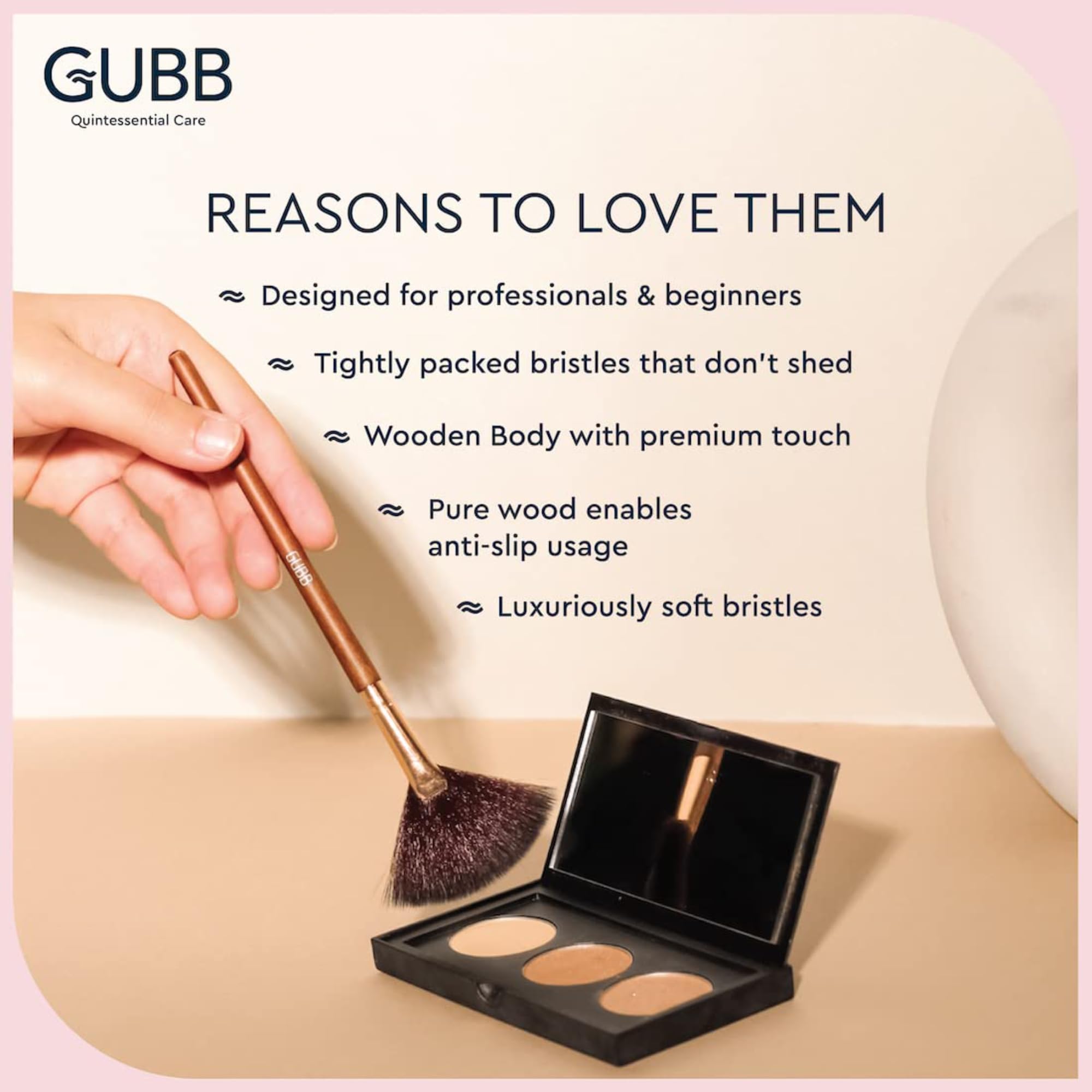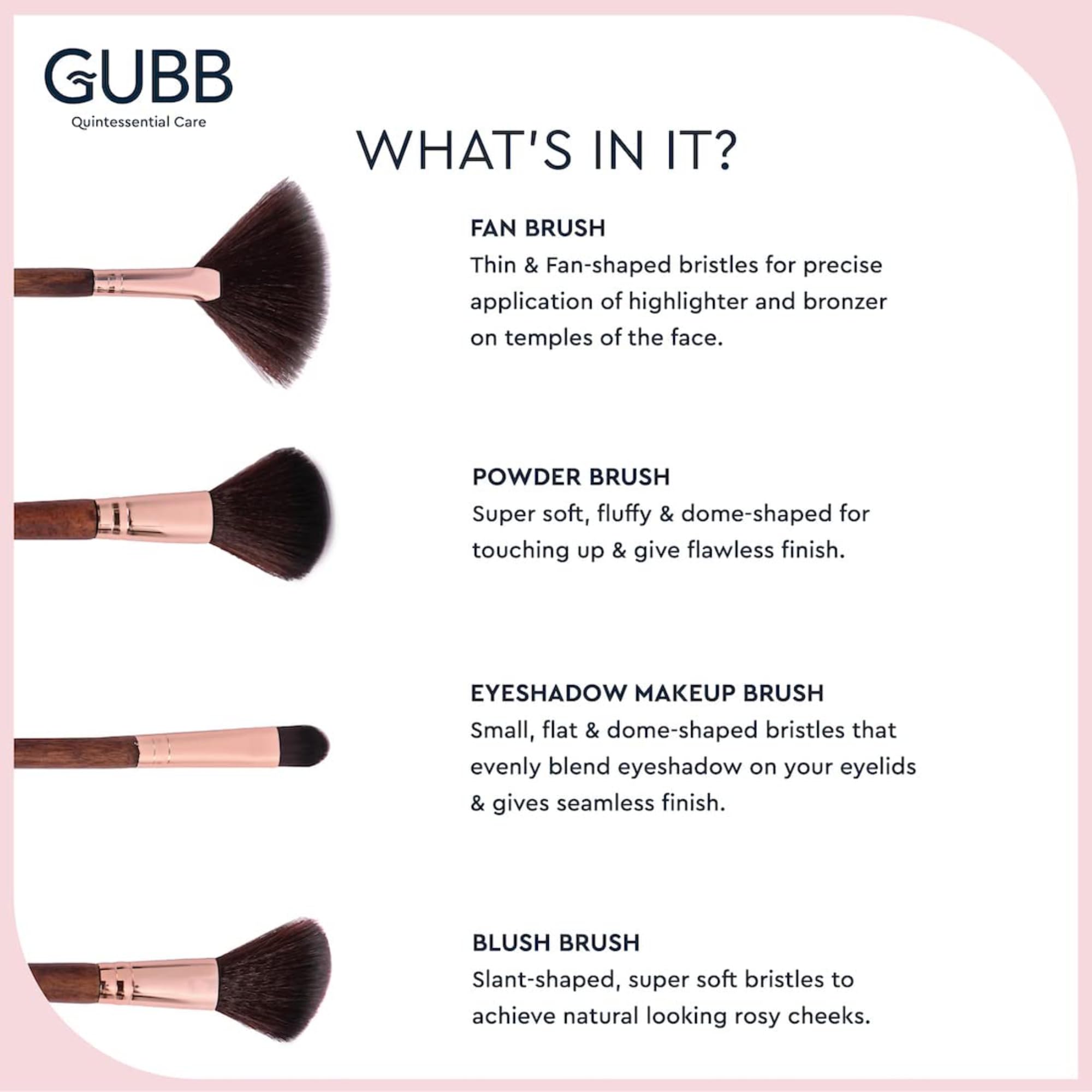 • GUBB USA presenting all the right makeup brushes to be your own makeup artist. Features Professional Range of Fan brush Powder brush Eyeshadow brush and a Blush Brush exclusively.