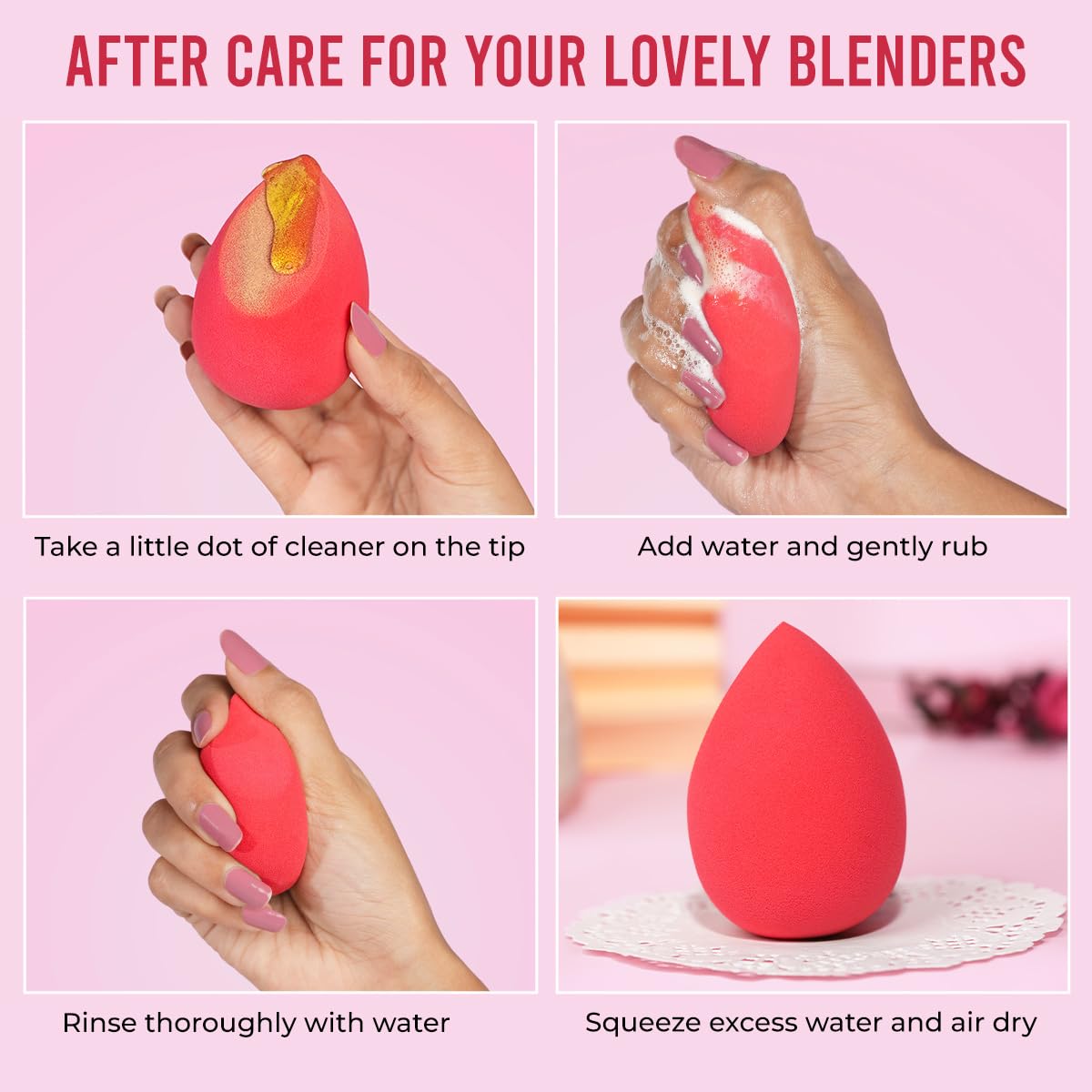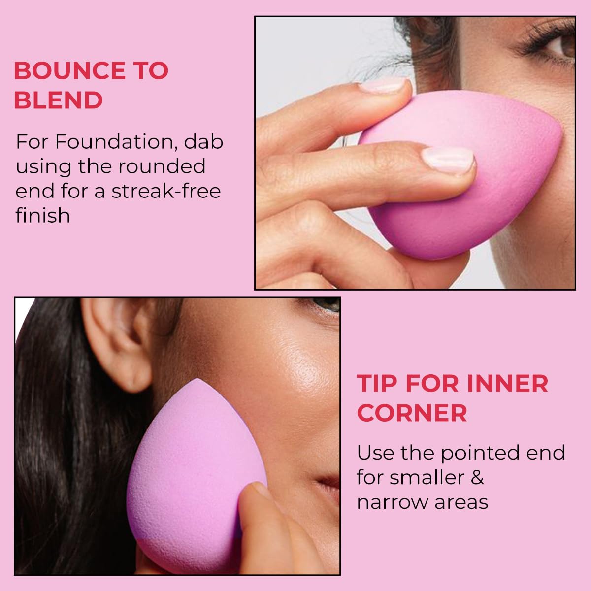 A BEAUTY BLENDER IS A MAKEUP TOOL USED FOR APPLYING OR BLENDING FOR WET AND DRY BASED BOTH. THIS BLENDER HAS UNIQUE OVAL SHAPE WITH POINTED TIP AND ROUNDED BASE WHICH SWELLS WHEN IT GETS WET. IT IS MADE OF A SOFT MATERIAL WHICH PROVIDES EVEN AND SMOOTH BLENDING WITHOUT ANY HARSH-LINES AND STREAKS AND ALLOWS PRECISE APPLICATION SUCH AS AROUND THE NOSE AREA AND UNDER EYES.