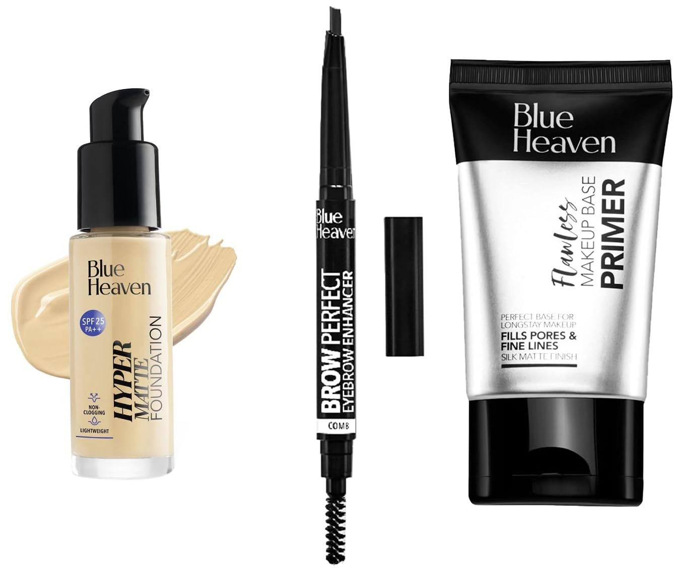 Blue Heaven Flawless Makeup Base Primer 30gA lightweight Formula with silicones and vitamins to soften Soothe and mattify your skin. Makeup Glides on and Stays Fresh For Hours. It Enhances the adherence to Make-Ups while used under Foundation Or Compact Powders. It Can also be used as base for eyeshadows and Blush Ons. Organic - yesBlue Heaven Artisto Eyebrow Enhancer Pencil & Styler Ash Grey0.30gContain special ingredients loaded with natural vegetable oil that shapes and nurture your eye brow perfect blend of pigment and moisturiser in retractable pencil form makes very easy to use and carry.Blue Heaven HyperMatte Foundation- 104 Natural 30mlBlue Heaven Hyper Matte Liquid Foundation is the perfect base to achieve a photo-finish matte look that lasts all day long. It provides buildable coverage blurs imperfections and gives a natural finish. This lightweight formula is waterproof transfer proof and has SPF 30 PA++ which protects your skin from harmful UV rays. Available in 7 shades with 2 cool tones and 5 warm tones.