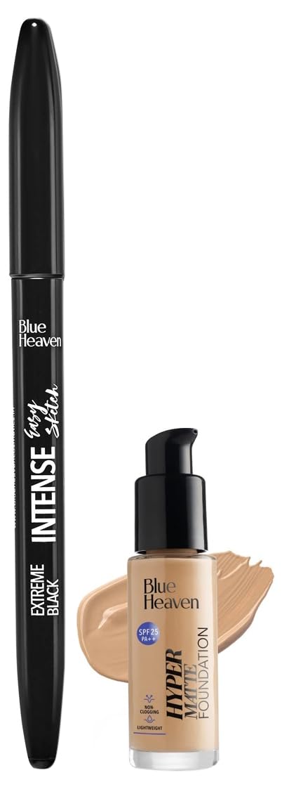 Blue Heaven Hyper Matte Foundation (302 Honey Tan Cream 30 ml)Blue Heaven Hyper Matte Liquid Foundation is the perfect base to achieve a photo-finish matte look that lasts all day long. It provides buildable coverage blurs imperfections and gives a natural finish. This lightweight formula is waterproof transfer proof and has SPF 30 PA++ which protects your skin from harmful UV rays. Available in 7 shades with 2 cool tones and 5 warm tones.Blue Heaven Intense Eyeliner Easy Sketch Black 1ml Matte FinishThis new-gen advanced eye writer pen delivers high color precision line around your eyes. Its fine felt tip applicator gives exact color which dries quickly and won't smudge or fade. Its water proof formula stays for longe