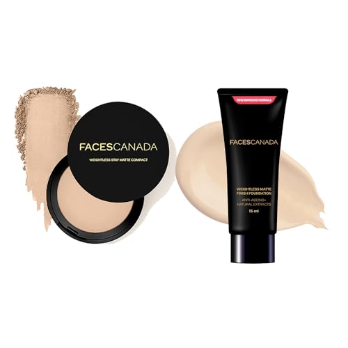Faces Canada Weightless Stay Matte Compact Vitamin E & Shea Butter Spf-20 Ivory 01 9 gFACES Cosmetics with a proud Canadian heritage spanning over 40 years offers an exclusive line of makeup skincare products and personal care accessories. FACES offer unparalleled variety in its products which are designed to suit every ethnicity skin type and tone complexion and texture.FACES products are globally acclaimed and are available at attractive price points in all its markets from North America to India. The wide assortment of shades textures and designs helps the FACES consumers capture every look and style right from casual to professional to glamorous.Faces Canada Weightless Matte Finish Foundation Mini - Ivory 18 mlA lightweight foundation packed in a small travel friendly tube the weightless matte finish foundation is just perfect for daily use. Enriched with the goodness of grape extract shea butter and olive seed oil this multi-benefit foundation blends effortlessly into the skin extending a soft matte finish that lasts through the day. Carefully formulated to not clog the pores the multi-benefit foundation comes with anti-ageing benefits. Dermatologically tested and suited for all skin types experience a naturally radiant makeup ready base everyday. Shade specification: ivory: the lightest shade and is made for those with pale to very fair skin complexion with both pink and neutral undertones natural: a shade which is a tone deeper than ivory but lighter than beige for fair skin with yellow undertones beige: a caramel shade deeper than natural and meant for those with warm yellow dusky complexion sand: the deepest shade which is meant for those with warm undertones with deeper complexions than beige know your skin tone: 1. Natural/ ivory: people who fall in this category appear pink or beige skin tone. If you look under your wrist your veins are mostly blue which denotes cool undertone. 2. Natural/sand/beige: people who fall in this category have slightly green brown skin tone/neutral undertone. If you look under your wrist your veins are a mix of blue and green. 3. Ivory/sand: people who fall in this category are dominantly yellow or golden skin tone. If you look under your wrist your veins are mostly green with warm undertone.