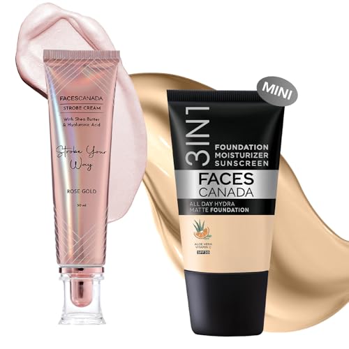 FACES CANADA Rose Glow Kit | Rose Gold Strobe Cream (30ml) + Absolute Ivory All Day Hydra Matte Mini Foundation (18ml) | Makeup Kit For Women (Combo Pack of 2)