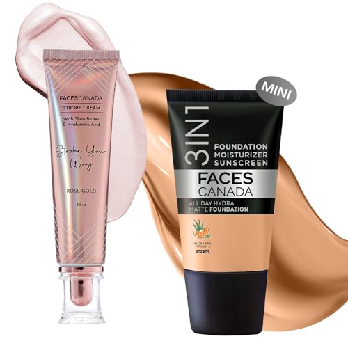 FACES CANADA Rose Glow Kit | Rose Gold Strobe Cream (30ml) + Warm Sand All Day Hydra Matte Mini Foundation (18ml) | Makeup Kit For Women (Combo Pack of 2)