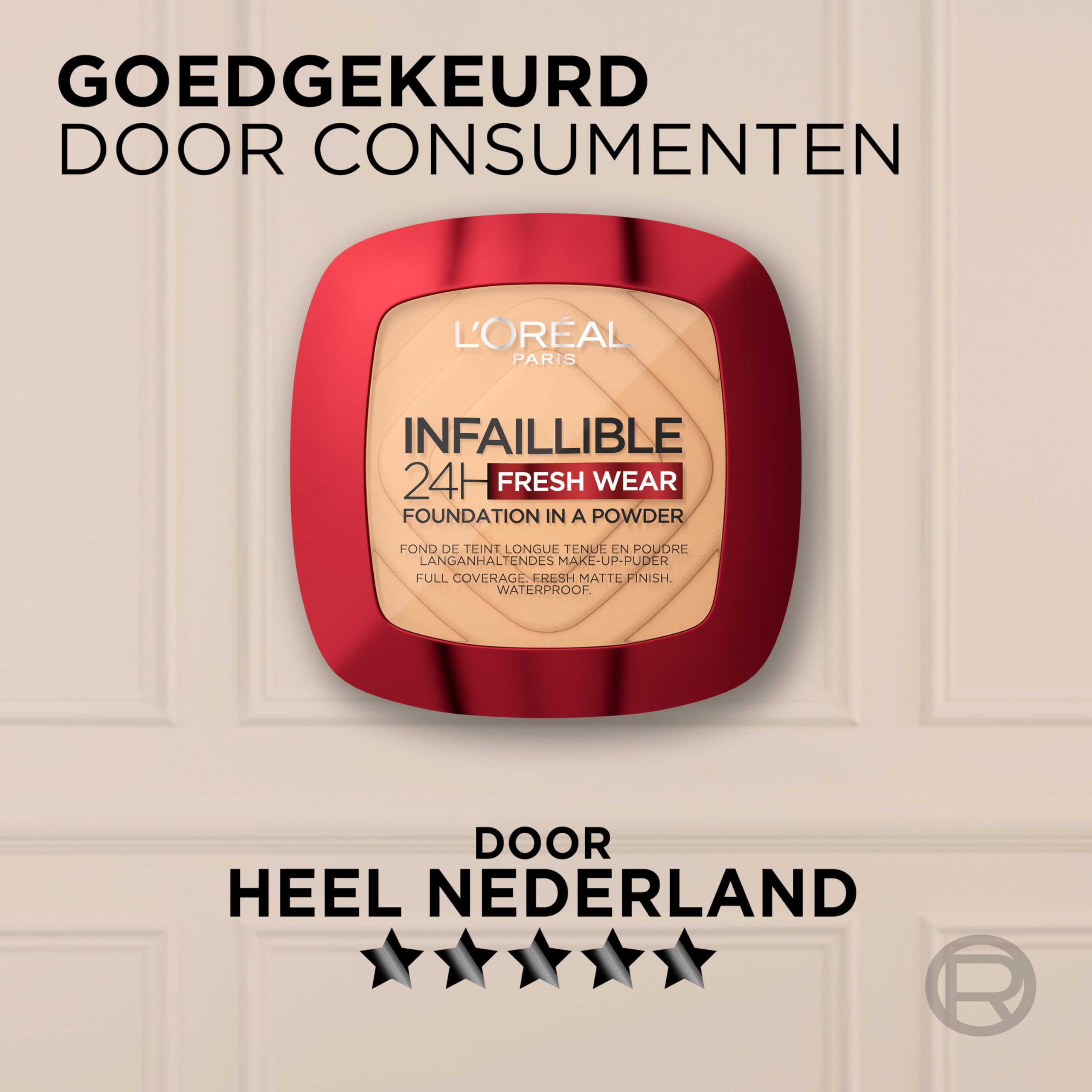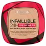 Loreal Paris Infallible 24H Fresh Wear Foundation in a Powder’s weightless texture gives full coverage and a natural matte finish that looks fresh hour after hour. The formula feels breathable and light leaving skin feeling comfortable for up to 24hrs. This lightweight powder foundation covers like a liquid and mattifies with no cakey look. The longwear formula is oil-free waterproof heatproof sweatproof non-comedogenic and suitable for all skin types.