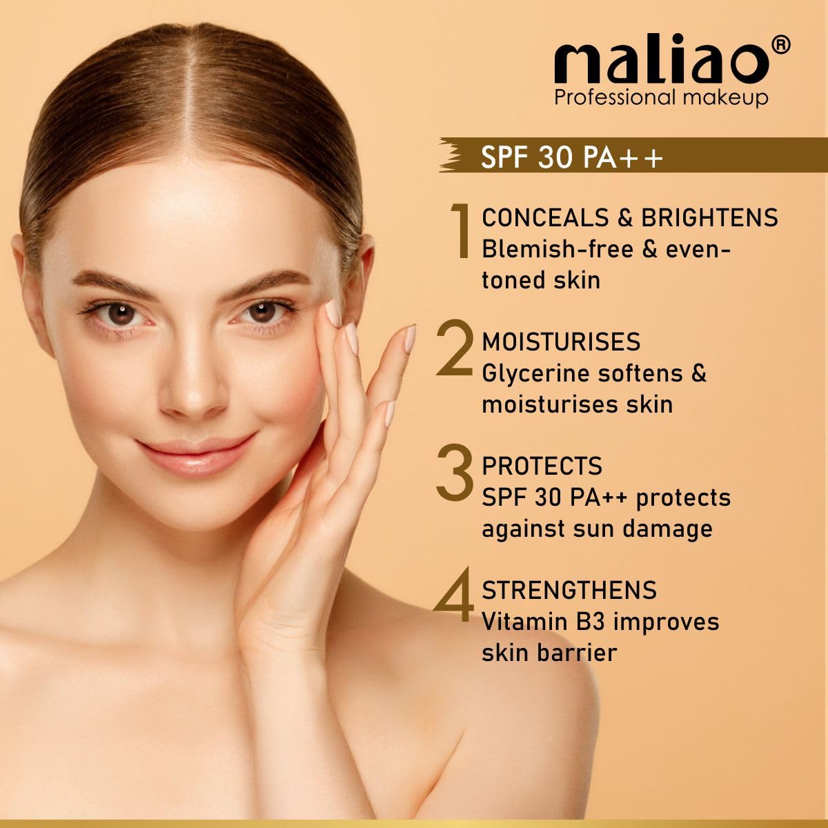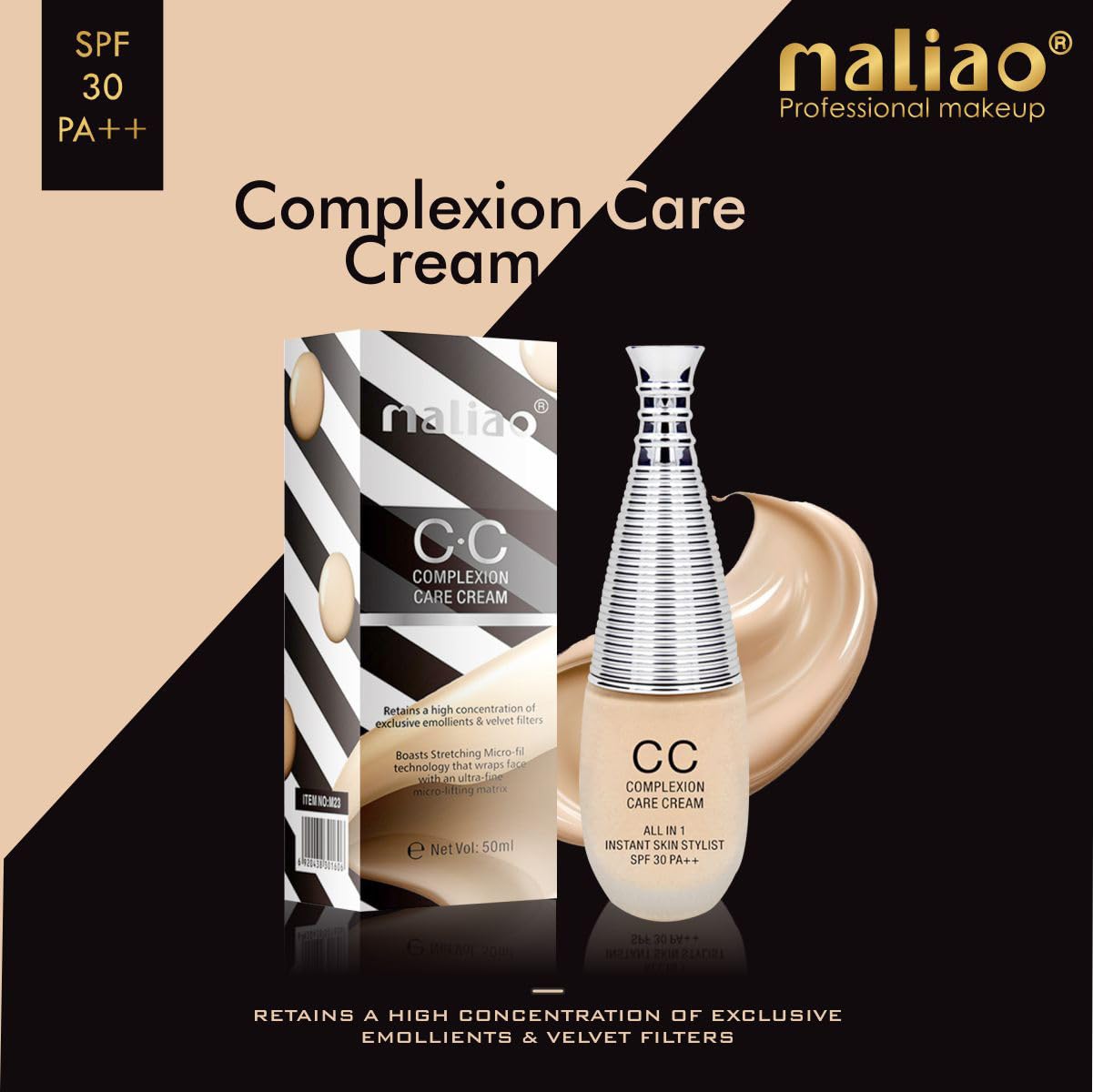 Maliao CC All In 1 Instant Skin Stylist Foundation Is The Perfect Solution For Achieving A Flawless Complexion. With Its Brightening Properties This Foundation Helps Clarify Dark Spots And Even Out The Skin Tone Giving You A Radiant Glow. Its Lightweight And Blendable Texture Ensure Seamless Application While The Matt Finish Provides A Smooth And Natural Look. This Foundation Is Water And Sweatproof Offering Long-lasting Coverage Throughout The Day. It Also Offers Spf 30 PA++ Protection Safeguarding Your Skin From Harmful Uv Rays. Made With High-quality Ingredients This Foundation Cream Is Suitable For All Skin Types And Is Cruelty-free. Elevate Your Makeup Routine With Maliao CC All In 1 Instant Skin Stylist Foundation.