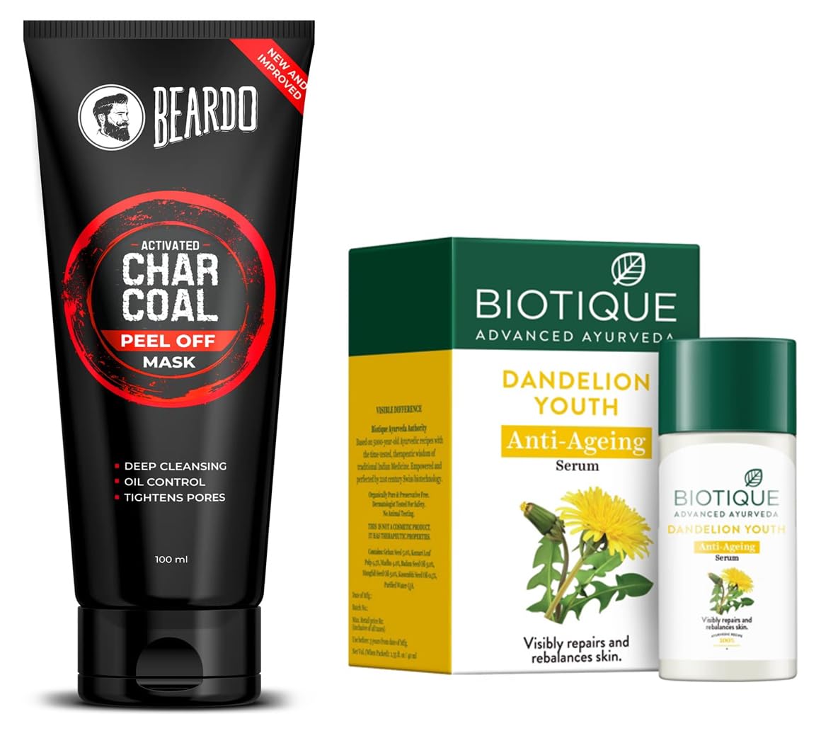 BEARDO Activated Charcoal Peel Off Mask, 100g (100gm) and Biotique Bio Dandelion Visibly Ageless Serum, 40 ml