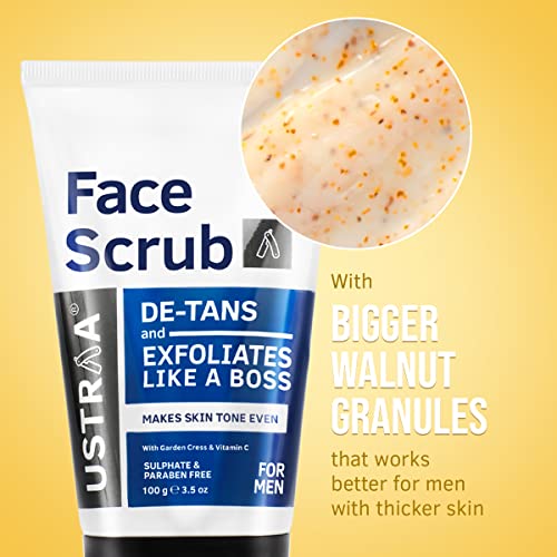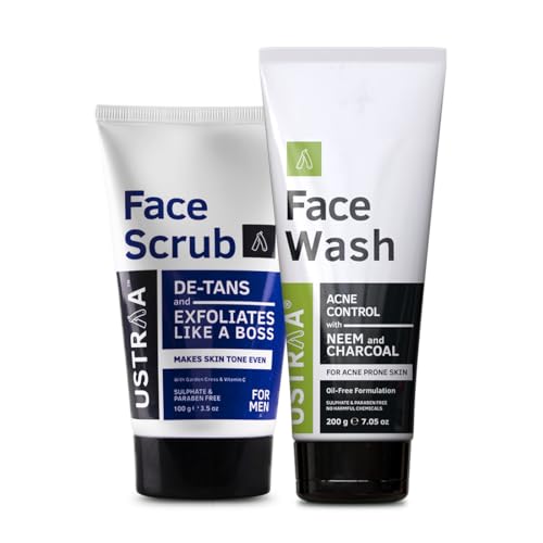Ustraa De-Tan Face Scrub for Men - For men who spend a lot of time outdoors or sweat it out at the gym this is a must. While a face wash cleans your face the scrub penetrates into the pores of your skin and removes the dead skin. Making the skin healthier. Pollution stress and lifestyle that involve eating a lot of junk food smoking or staying up late affect your facial skin health. This ultimately leads to pimples whiteheads blackheads uneven color tone and dryness. The Ustraa face scrub helps repair your skin from all that and also de-tanning. Big walnut granule sizes work more efficiently on a man's face as we men have thicker skin. Ustaa Face Wash Acne Control - The anti-septic skin healing properties of neem and the badass cleansing action of charcoal come together in this face wash to give your face extra protection against acne and break-outs. An oil-free formulation this also helps keep your face oil-free for longer. So you don't feel sticky and oily all day. Specially formulated for sensitive and acne prone skin This face wash has no sls no paraben and no harmful chemicals.