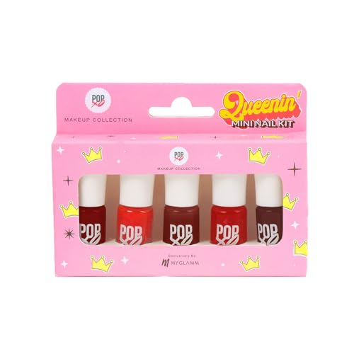 MyGlamm POPxo Makeup Collection -Mini Nail Kit-Queenin' Glossy Finish-5X3ml"Confidence level: queenin' 24x7! Queenin' is a stunning set of 5 chip-resistant red nail polishes that are the perfect match for all your red hot and #spicy manicure moods. Let your sassy self run wild! Always having a set of freshly painted nails is every girl's ideal state of living. While frequent salon visits can be heavy on the pocket there is one fun trick that won't break the bank. Bring the priceless feeling of new nails home with popxo makeup collection's queenin' mini nail kit. This mini nail polish kit includes 5 nail paints in bold shades of red that are sure to make a statement wherever you go. These mini nail polishes have a chip resistant formula and offer a long-lasting wear. They have a high gloss finish and make your digits look oh-so-fab. So are you ready to be your own nail technician? "MyGlamm POPxo Makeup - Mini Nail Kit - Bestie - 15ml (Set of 5) | Glossy Nail Polish Set | Long Lasting & High Gloss Effect | Chip Resistant Nail Paints | Cruelty-free & VeganVacay Mood: 24*7 This stunning kit of 5 chip-resistant nail polishes comes in bright poppin' colours to give you major beachy vibes. Escape the ordinary and let your mani dish out #VacayGoals! A set of freshly painted nails is every girl's happy place. While frequent salon visits can be heavy on the pocket there is one fun trick that won't break the bank. Bring the priceless feeling of new nails home with POPxo Makeup Collection's Vacay Mini Nail Polish Set. It includes 5 nail paints in bright shades of pink peach blue red & turquoise perfect for that vacay mood. All nail colours in this mini nail polish kit are made with a chip-resistant formula and offer long-lasting wear. Its high gloss effect gives your at-home manicure a salon-like shine. Are you ready to flaunt those gorgeous nails?