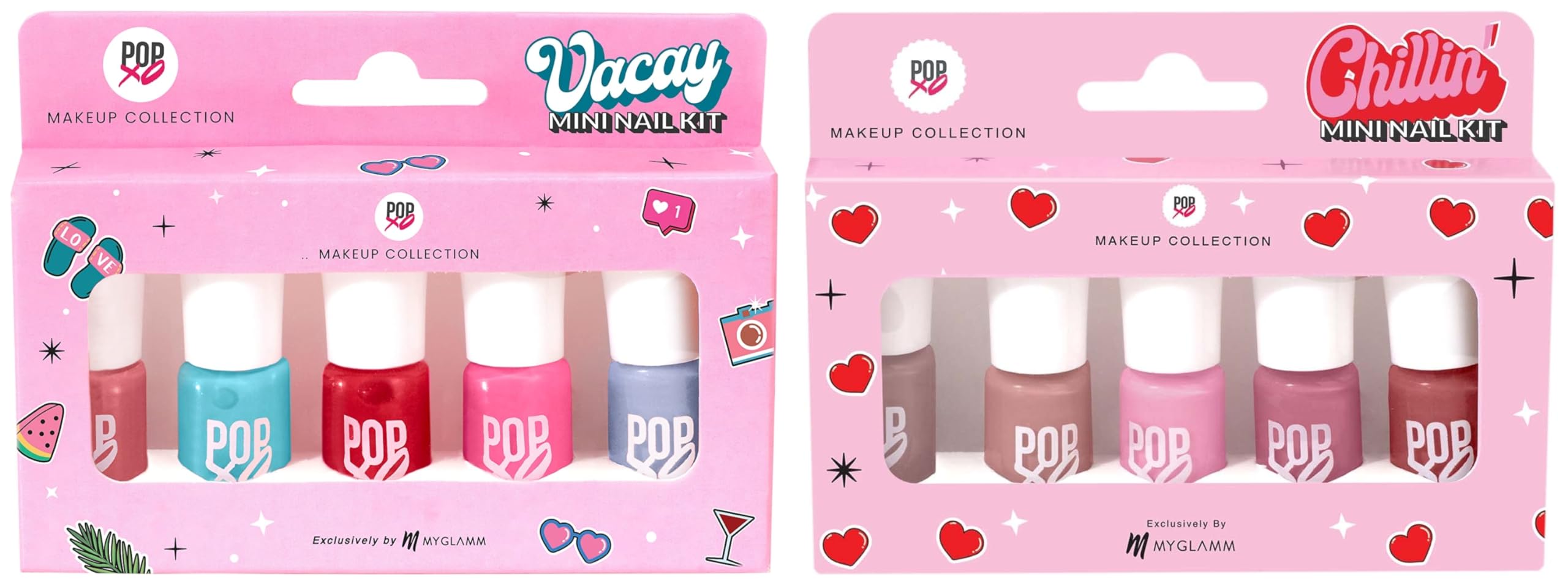 MyGlamm POPxo Makeup Collection Chillin' Mini Nail Kit Paraben Free Long Lasting Formula 5 in 1 ComboChillin' like a villain Chillin' is a ravishing nail kit of 5 chip-resistant nail polishes in breezy nudes and blushing pinks. It is perfect for a goes-with-everything mani. This thoughtfully curated selection of everyday neutrals is #AnythingButBasic. A set of freshly painted nails are every girl's ideal state of living. While frequent salon visits can be heavy on the pocket there is one fun trick that won't break the bank. Bring the priceless feeling of new nails home with POPxo Makeup Collection's Chillin Mini Nail Polish Set. It includes 5 nail paints in nude and blush shades that are perfect for a chilled out vibe. This mini nail polish collection is made with a chip resistant formula and offers a long-lasting wear. Its high gloss effect gives your at-home manicure a salon like shine. Are you ready to be your own nail technician?MyGlamm POPXO MINI NAIL KIT - VACAY-Bloody Mary Perfect Peach Beach Please Pink - nic Sea Ya -Paraben Free Long Lasting Formula valentine gift set 5 in 1 Combo(Pack of 5) - 15mlThe BFF your nails need! This classic set of 5 nail polishes contains all your fav go-to shades. When in doubt choose one (or more) of these stunners to ace that #AlwaysOn look. Oh and theyre chip-resistant too. A set of freshly painted nails is every girls happy place. While frequent salon visits can be heavy on the pocket there is one fun trick that won't break the bank. Bring the priceless feeling of new nails home with POPxo Makeup Collection's Bestie Mini Nail Polish Set. It includes 5 nail paints in bright shades of peach brown white black and red; perfect for painting your and your best friends nails. All nail colours in this mini nail polish kit are made with a chip-resistant formula and offer long-lasting wear. Its high gloss effect gives your at-home manicure a salon-like shine. Are yall ready to flaunt those gorgeous nails?