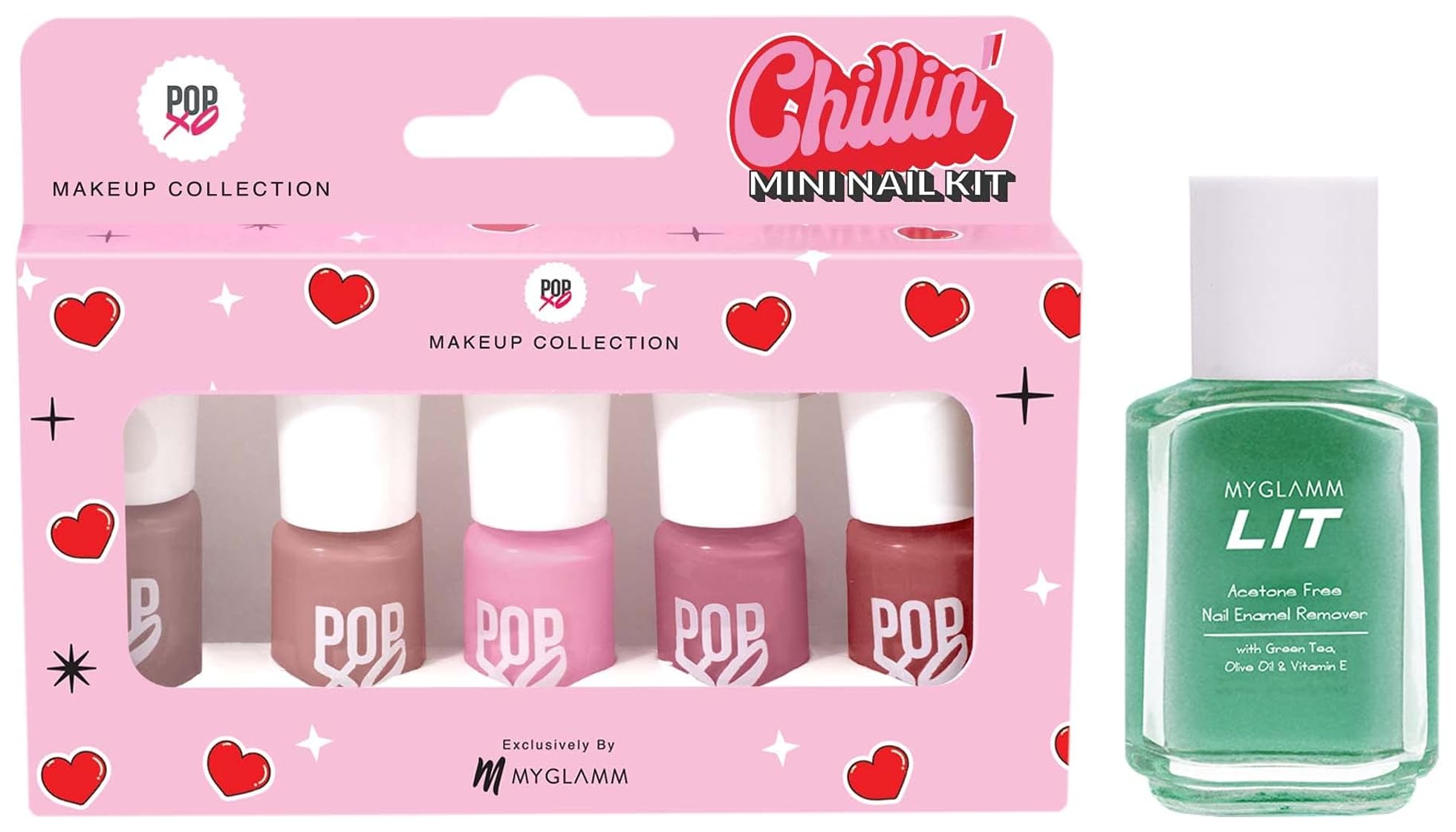 MyGlamm POPxo Makeup Collection Chillin' Mini Nail Kit Paraben Free Long Lasting Formula 5 in 1 ComboChillin' like a villain Chillin' is a ravishing nail kit of 5 chip-resistant nail polishes in breezy nudes and blushing pinks. It is perfect for a goes-with-everything mani. This thoughtfully curated selection of everyday neutrals is #AnythingButBasic. A set of freshly painted nails are every girl's ideal state of living. While frequent salon visits can be heavy on the pocket there is one fun trick that won't break the bank. Bring the priceless feeling of new nails home with POPxo Makeup Collection's Chillin Mini Nail Polish Set. It includes 5 nail paints in nude and blush shades that are perfect for a chilled out vibe. This mini nail polish collection is made with a chip resistant formula and offers a long-lasting wear. Its high gloss effect gives your at-home manicure a salon like shine. Are you ready to be your own nail technician?MyGlamm LIT Nail Enamel Remover 30 ml | Acetone-free Nail Polish Remover | Enriched with Green Tea Olive Oil & Vitamin ELIT NER is an acetone free hydrating formula which removes nail enamel in just 1 swipe. It contains Green tea extracts Olive oil and Vit E Cruelty-free Vegan Paraben-free Phthalate-free SLS-free Mineral oil-free Triclosan-free TEA-free Silicone-Free Gluten-free Contains Natural Extract Sulfate-Free Formaldehyde-Free Triclosan Free TEA-Free D5 Free