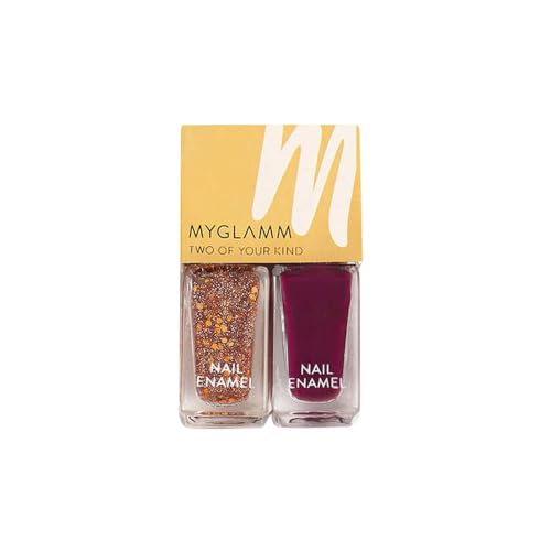 MyGlamm Two Of Your Kind Nail Enamel Duo - The Glitter Collection 12 gorgeous shades for the perfect glamm nails Carnival Crush: A splash of hot pink & silver glitter for a candy floss-filled night at the carnival. Bring The Bling: A splash of magenta pink & red-pink glitter for a night that calls for some champagne. Steal The Show: A splash of tomato red & a mix of glitter for a date night at the movies. High On Drama: A splash of blood-red & gold glitter to ânail' the retro karaoke night. Party Parade: A splash of berry purple & pink silver glitter that looks striking when wrapped around a glass of sangria. Wicked Wish: A splash of aubergine & copper glitter for an unforgettable girls' getaway.