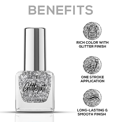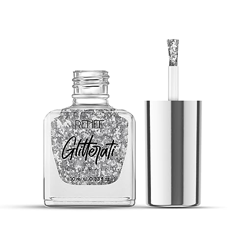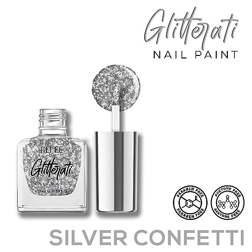 RENEE Glitterati Nail Paint- Silver Confetti 10ml | Quick Drying, Glittery Finish, Long Lasting, Chip resisting Formula with High Glitter & Full Coverage | Acetone & Paraben Free