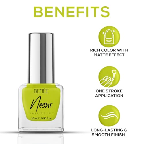 Achieve a stunning nail look with RENEE Neon Nail paints by following a simple application process. Begin by applying the first coat at the nail's center ensuring precision and even coverage. Extend the vibrancy by following up with strokes on each side of the nail. Allow the first coat to dry and if desired apply a second coat for intensified color. RENEE Neon Nail paints stand out for their fluorescent vibes offering a range of vivid shades that electrify your nails with a pop of vibrant color. Crafted with a highly pigmented formula these shades not only add a bold and electrifying touch to your nails but also infuse a quirky and trendy vibe into your overall look enhancing your style effortlessly. Stand out with fluorescent vibes using RENEE Neon Nail paints. Crafted with highly pigmented formula these vivid shades add a pop of electrifying color to your nails and add more quirk to your look.