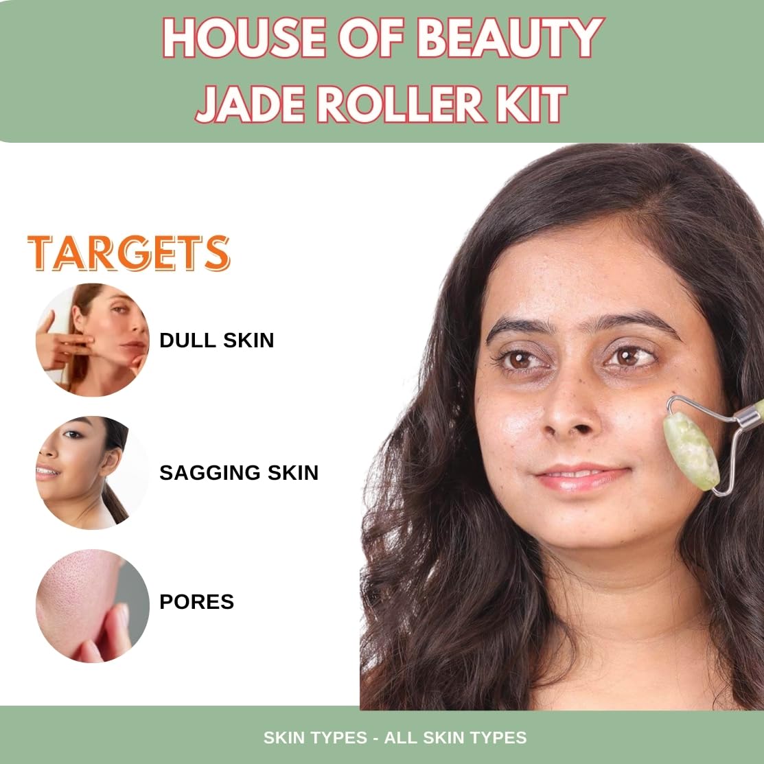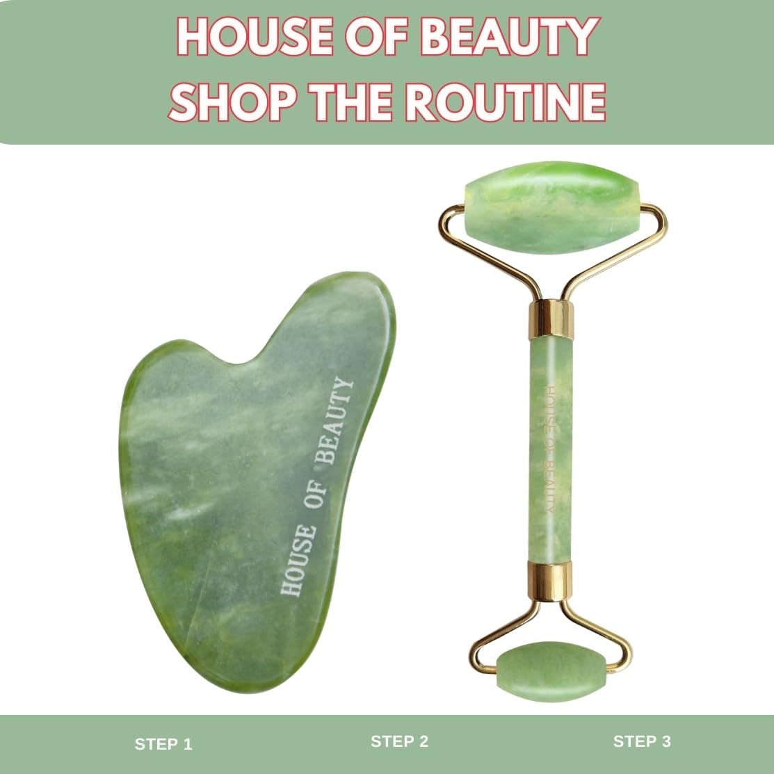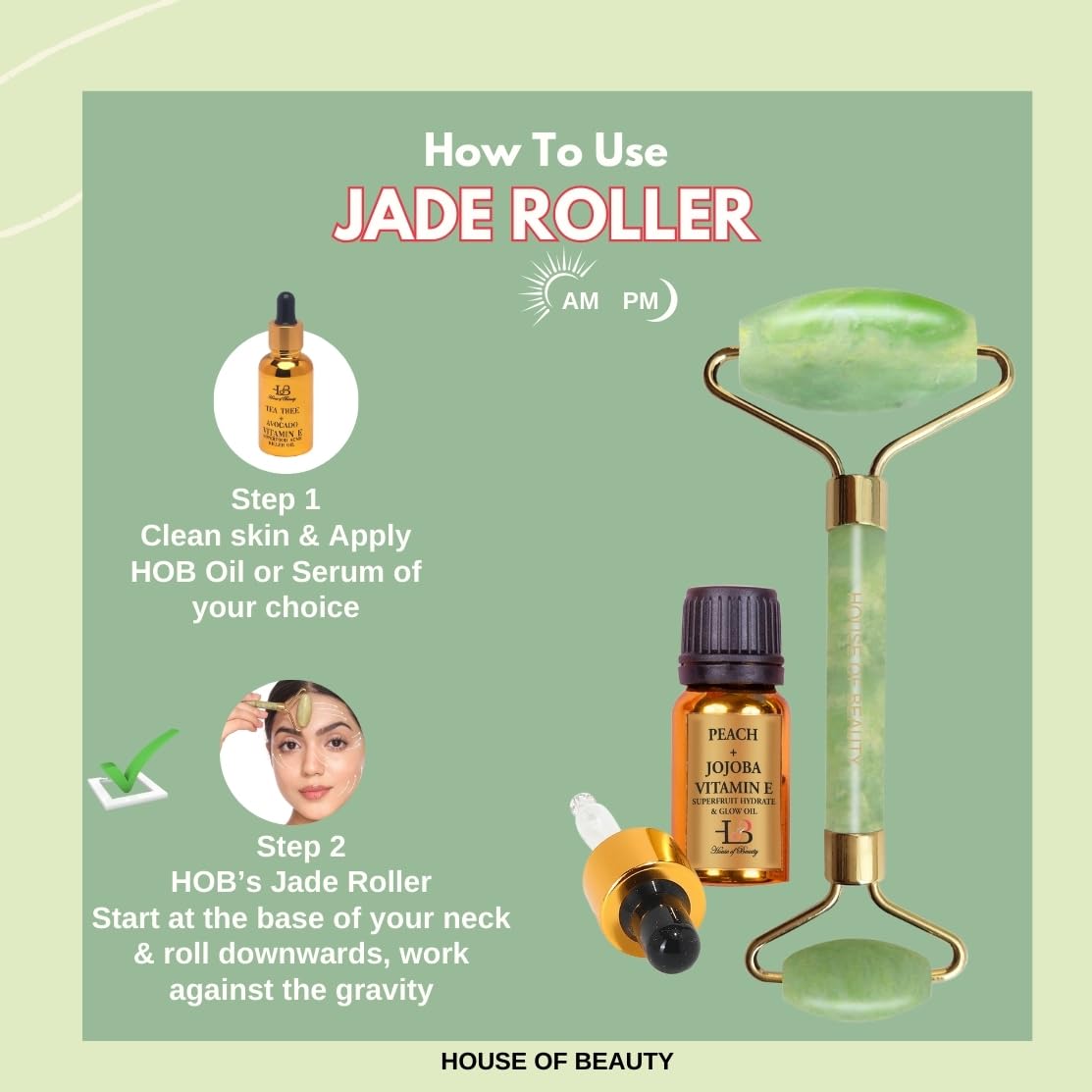 HomeBeautySkin ToolsFace MassagersHOUSE OF BEAUTY Jade Roller with Oil Natural Stone Double Sided Massager for Face Neck Arm to Healthy All Type Of Skin (Green)