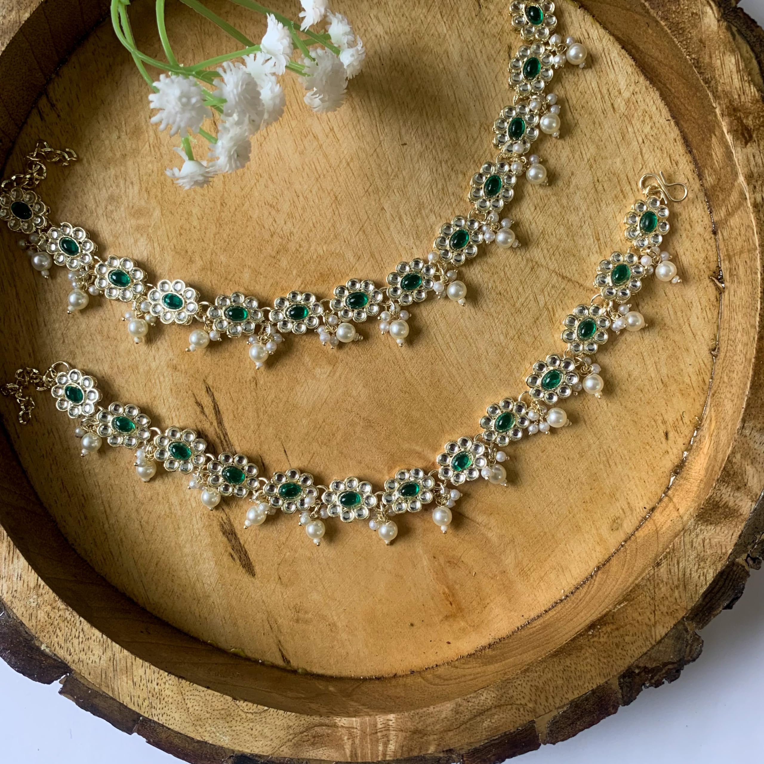 These traditional Kundan stone studded adjustable anklets for women are a perfect combination of elegance and tradition. The anklets are adorned with Kundan stones which are traditional Indian gems that add a touch of glamour to the design. They are handcrafted by skilled artisans with attention to detail ensuring that each anklet is unique and of high quality. The anklets come with an adjustable chain that can be adjusted to fit most sizes making them easy to wear for women of different ages and sizes. They feature a traditional Indian design that makes them perfect for weddings parties and other cultural occasions. The anklets are made of high-quality materials that ensure durability and longevity so they can be worn for years to come. These anklets are lightweight and comfortable to wear making them perfect for extended use during special occasions. They also feature stone studded charms that add a beautiful finishing touch to the design. These anklets are versatile and can be paired with traditional Indian attire or modern outfits making them a great addition to any jewelry collection.