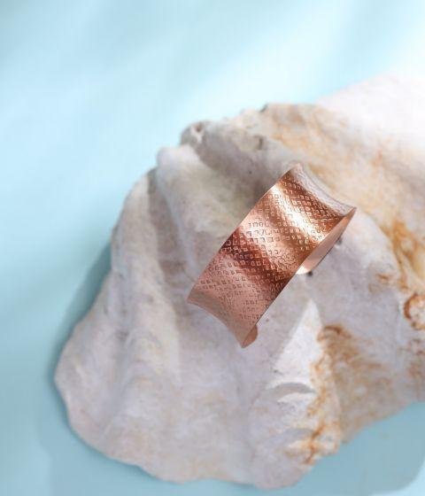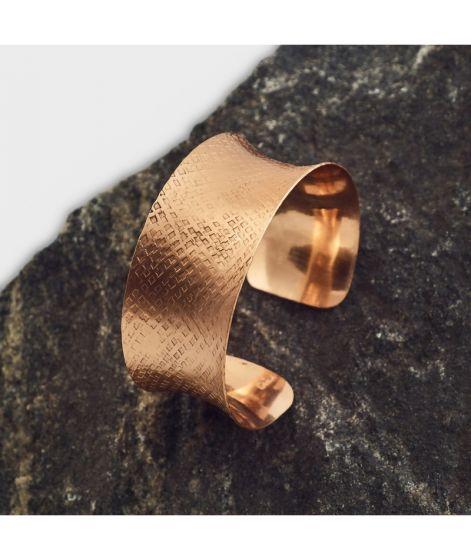 With a glamorous and stunning ethnic look, this simple, antiquarian copper cuff that has a hammered texture can fit well over many wrist sizes as both ends are open, and goes with both Indian and Western attire.