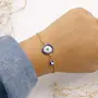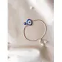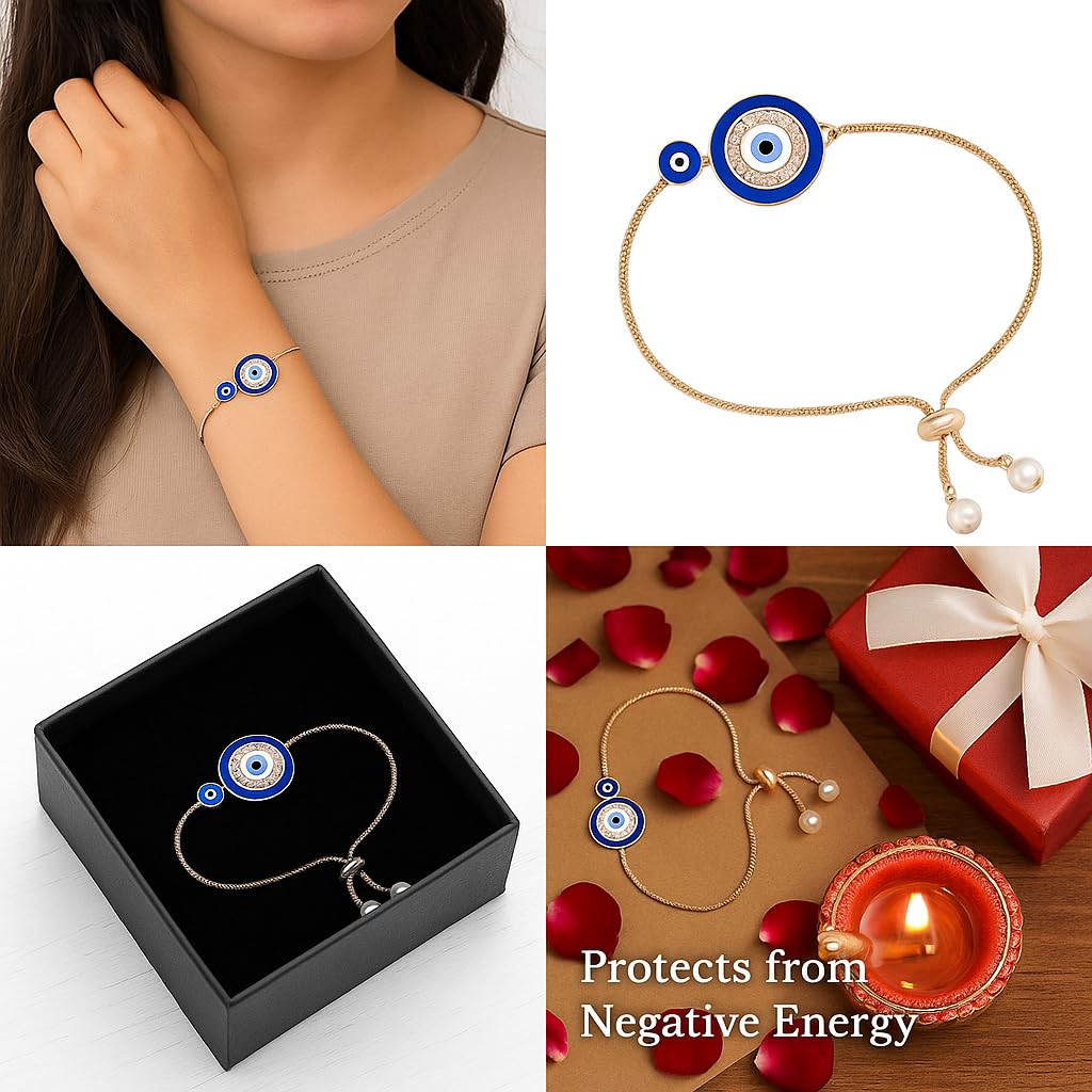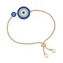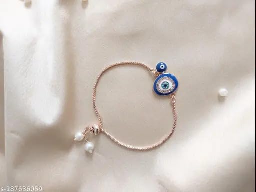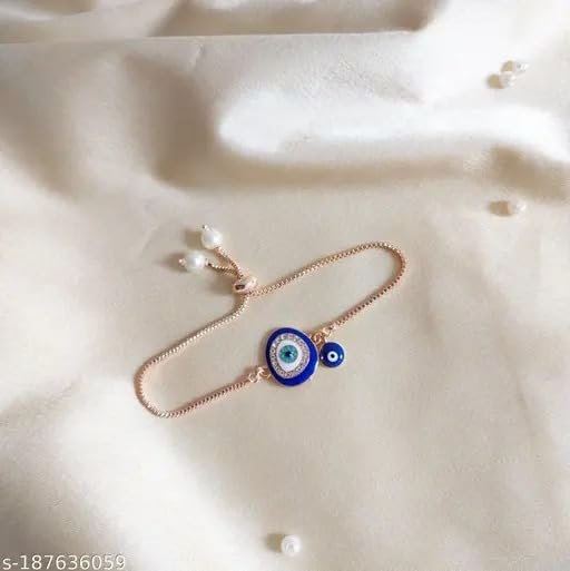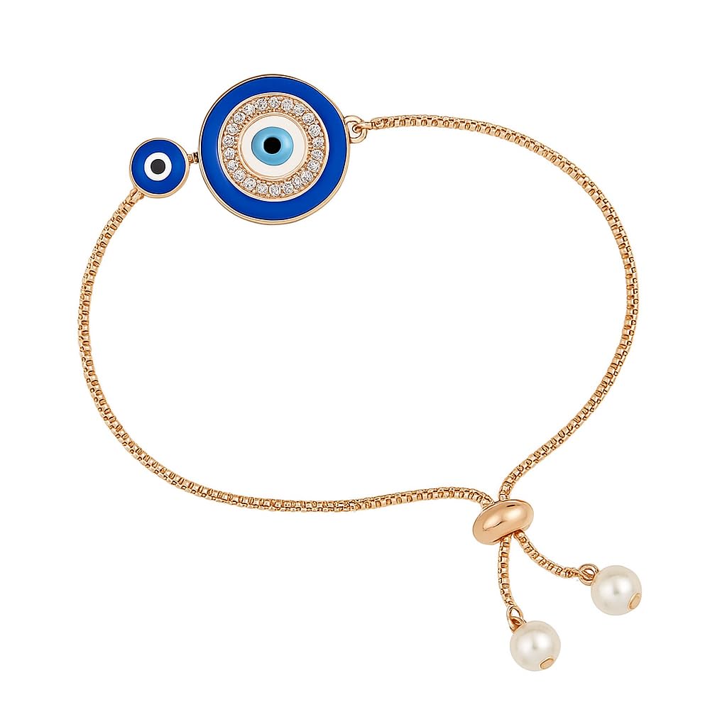 Add a touch of mystique and elegance to your jewellery collection with this stunning Evil Eye adjustable bracelet. The sophisticated design features a rose gold-toned chain adorned with two eye-catching Evil Eye charms in vibrant blue enamel - one larger medallion embellished with sparkling crystals and a smaller complementary charm. The delicate box chain is beautifully balanced with twin pearl drops at the adjustable closure allowing for a perfect fit. This versatile piece combines traditional symbolism with contemporary style making it suitable for both everyday wear and special occasions. The sliding closure mechanism ensures comfortable wear while the high-quality finish promises lasting beauty. The bracelet artfully blends classic elements like pearls with modern design sensibilities creating an accessory that's both meaningful and fashionable.