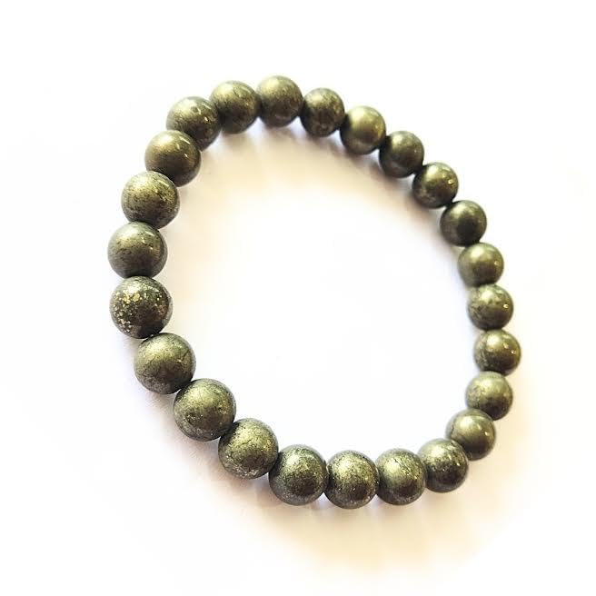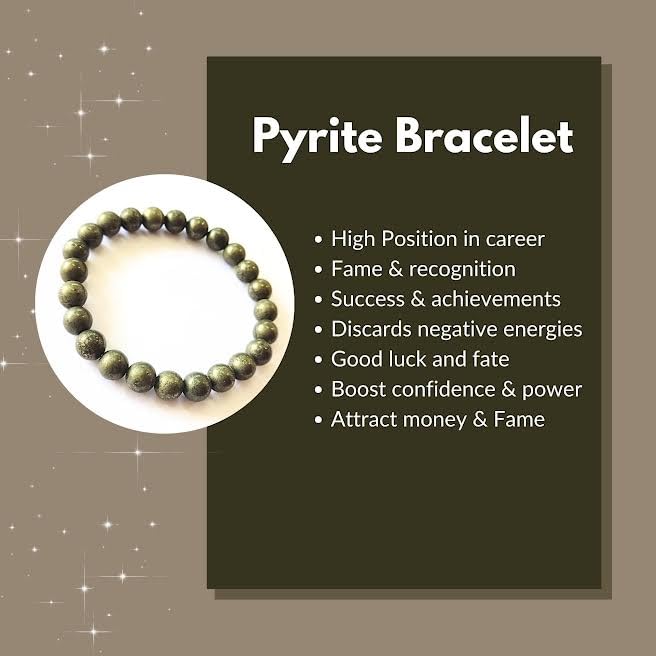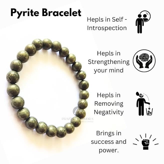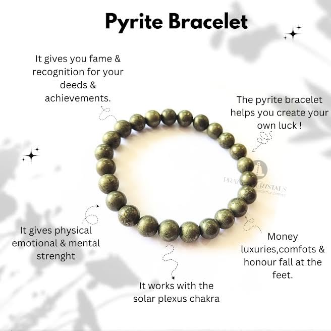 Pyrite has long been valued as a strong protection stone that shields the wearer from negative energy as well as environmental pollutants. Thus this stone helps promote physical well-being as well. Stimulating the second and third chakras pyrite enhances the strength of mind and willpower. Balancing energy and chakras: Pyrite is associated with balancing and aligning the energy centers in the body known as chakras. It is believed to help restore balance vitality and harmony. Wearing a golden pyrite bracelet may aid in balancing and activating the chakras promoting overall energetic well-being.