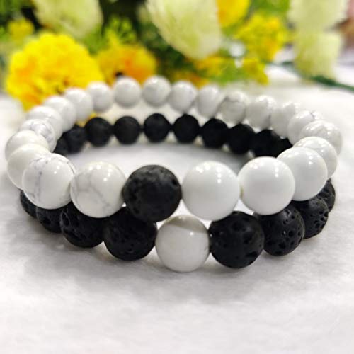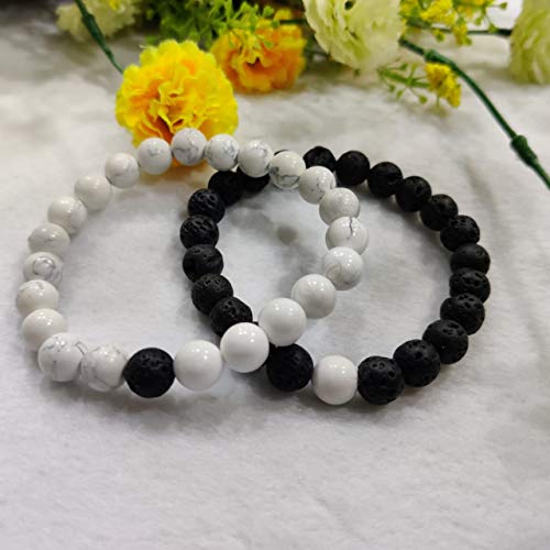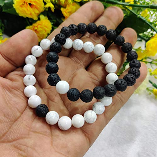 Crystal Cave Exports Natural Black and White Lava and Howlite Stone 8 MM Yoga Couple Bracelet 2-Pieces for Men and Women Healing Crystal Bracelet White Howlite: Boost Patience Aid Insomnia & Stress Calms Anger. Howlite stones have a lovely soothing energy that will help to alleviate stress and may help to calm fits of anger and bad temper. They have extremely useful metaphysical properties that will aid you to deal with belligerent or aggressive people. Their energy may calm both you and the other person. They may also heighten the level of patience you are feeling about what is happening. For anyone having sleeping difficulties place a piece under your pillow as it is known to alleviate insomnia. They are beneficial third eye and crown chakra stones that are helpful used in meditation and for researching past lives.