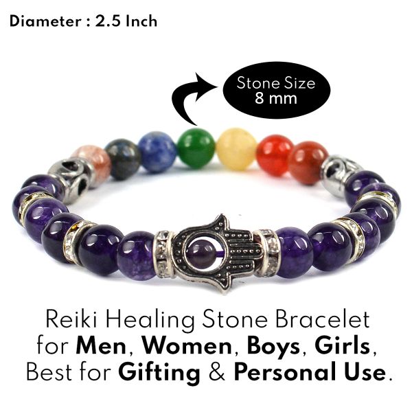 Reiki Crystal Products Natural Amethyst Bracelet with 7 Chakra Hamsa Charm 8mm Round Bead Bracelet for Reiki Healing and Crystal Healing Stones
