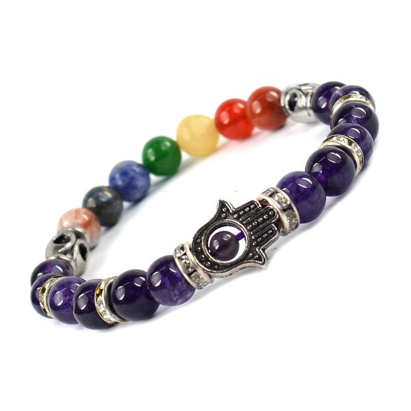 Reiki Crystal Products Natural Amethyst Bracelet with 7 Chakra Hamsa Charm 8mm Round Bead Bracelet f