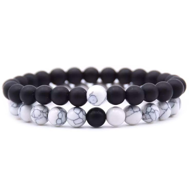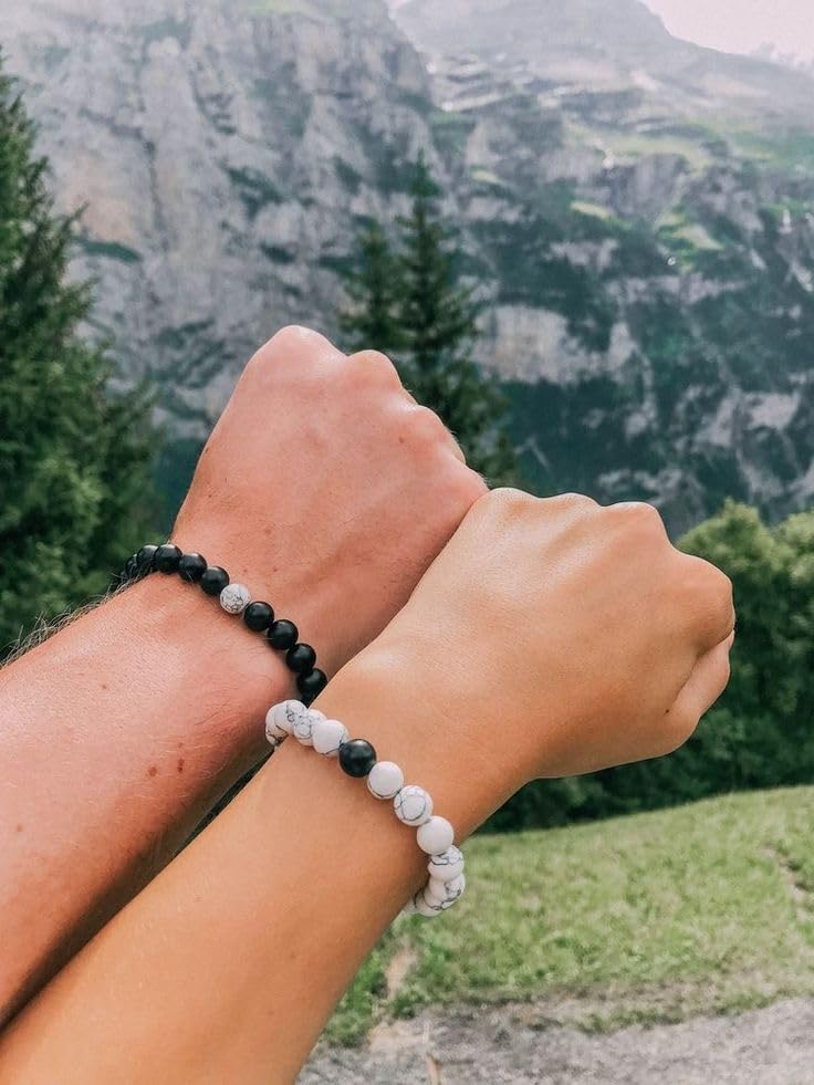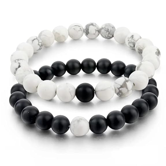 Sukhad Couple Bracelet Fashion Distance Natural Stones Reiki Yoga Healing Unisex Bracelet for Men and Women Black And White Stretchable Handmade Bracelets | Wrist fit Size | Stone Size - 8Mm | Stylish Daily/Party/Office/Casual Wear Healing Accessories For Men/Women/Boys/Girls. Best For Gifting & Personal Use.