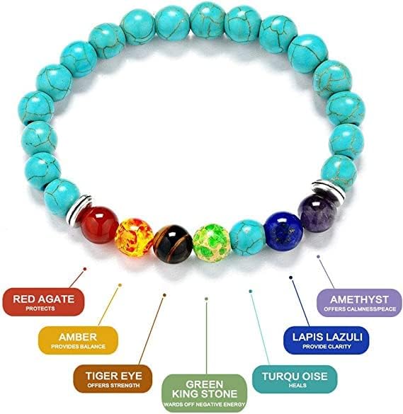Firoza 7 Chakra Bracelet - Balance and Harmony Natural Firoza Gemstones: Each bead represents one of the seven chakras promoting spiritual and physical well-being. Elastic Design: Comfortably fits most wrist sizes making it perfect for daily wear. Chakra Balancing: The bracelet is designed to assist in aligning and balancing the body's energy flow. Stylish and Versatile: Whether worn alone or layered with other bracelets the Firoza 7 Chakra Bracelet adds a touch of elegance to any outfit. Promotes Positive Energy: Embrace positivity and mindfulness as you wear this beautiful bracelet throughout your day. How to Use: Wear the Firoza 7 Chakra Bracelet on your wrist to experience the potential benefits of chakra balancing. Focus on each gemstone and its associated chakra during meditation or mindfulness exercises for enhanced spiritual awareness. Bring balance positive energy and a touch of style into your life with the Firoza 7 Chakra Bracelet. Order yours today and embark on a journey of well-being.