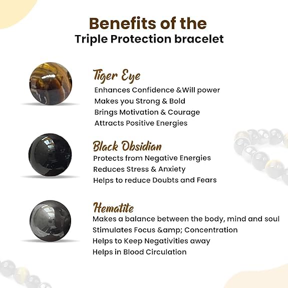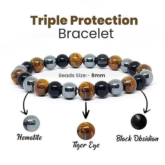 Triple Protection Bracelet a meticulously crafted piece of energy-infused jewelry designed to shield and empower. Each bracelet comes with a lab certificate ensuring the authenticity and quality of the featured gemstones. Immerse yourself in the harmonious blend of Black Obsidian Hematite and Tiger's Eye renowned for their protective properties. Lab Certified Authenticity: At the core of our commitment to quality lies the assurance of authenticity. The lab certificate accompanying each Triple Protection Bracelet guarantees that you are receiving a genuine and powerful combination of Black Obsidian Hematite and Tiger's Eye. Immerse yourself in the pure and unadulterated energy of these crystals knowing that you have a certified piece of nature's marvel at your fingertips. Triple Layered Protection: Delve into the mystical world of crystal healing with the triple protection offered by Black Obsidian Hematite and Tiger's Eye. Black Obsidian forms a formidable shield against negative energies creating a protective barrier around you. Hematite with its grounding properties enhances focus and concentration providing mental clarity during challenging times. Tiger's Eye known for its balancing energy promotes harmony helping you navigate the ups and downs of life with ease.